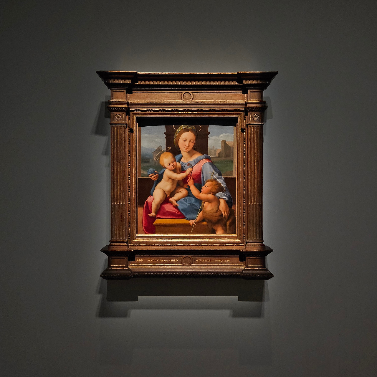 <성모자(聖母子)와 세례 요한>는 성모 마리아와 아기 예수 그리고 세례 요한을 삼각형 구도 속에 배치하였다. 성모 마리가 화면의 중심축이라 삼각형 구도가 더욱 안정감이 있다. 그리고 창문 사이의 교외를 보면 다빈치의 <최후의 만찬> 예수의 뒷배경처럼 인물과 화면에 조화를 이루고 있다. 더불어 창문과 인물들의 음영이 성화(聖畫)의 격을 갖추고 있다. 작은 그림이만 르네상스 3대 화가인 라파엘로를 유럽이 아닌 곳에서 볼 수 있어 감격스러웠다.