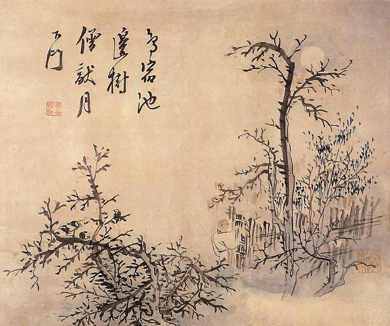 <월하고문도(月下敲門圖)>를 보면 보름달이 오른편 상단 나무에 걸려있는 듯 떠 있다. 나무는 굵게 선을 주어 고목(古木)처럼 느껴지며 나뭇가지에 잎이 있을 듯 말 듯 넣어 가을의 적막함으로 다가온다. 보름달은 연청(軟靑)의 담채로 맑게 홍운탁월(烘雲托月) 하였다.