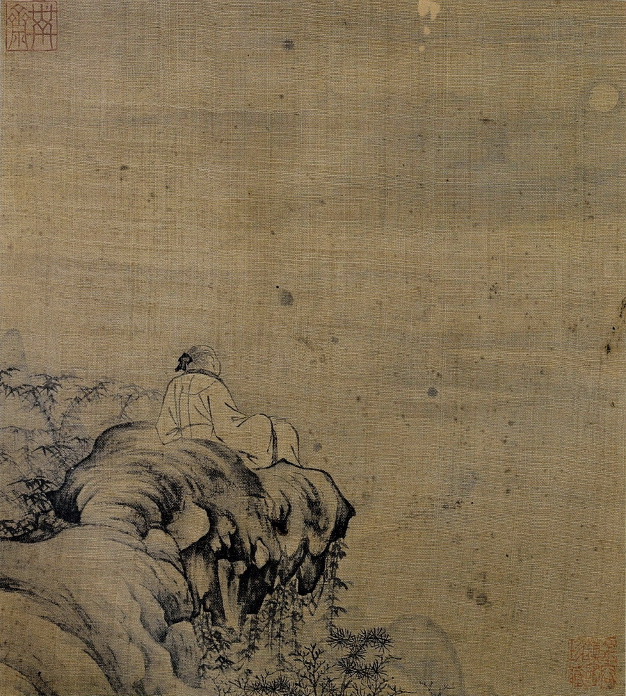 이 전 시대와 달리 달의 윤곽선을 뚜렷하게 표현하여 명확한 달을 강조한 것을 알 수 있다. 달빛 아래에 적힌 화제는 “가을의 소리는 귀에 가득한데 사람은 오지 않고, 거문고 뜯으며 긴 휘파람 부니 달이 떠오른다(滿耳秋聲人不到, 彈琴長嘯月來待).” 왕유의 시구(詩句)로 병풍의 그림과 일맥상통(一脈相通) 한다.