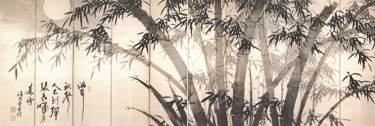 <월하죽림10폭병풍(月下竹林十幅屛風)>를 보면 10폭 병풍에 통죽(統竹)이 모여 죽림(竹林)이 되었다. 화면에 꽉 차 있는 통죽(統竹)을 보면 정말 대숲에 들어온 것 같은 공간감을 선사한다. 보름달은 왼편 상단을 꾸린 폭에 크게 자리 잡고 있으며 달을 감싼 구름이 3폭이나 할애하여 만월(滿月)의 웅장함이 느껴진다.