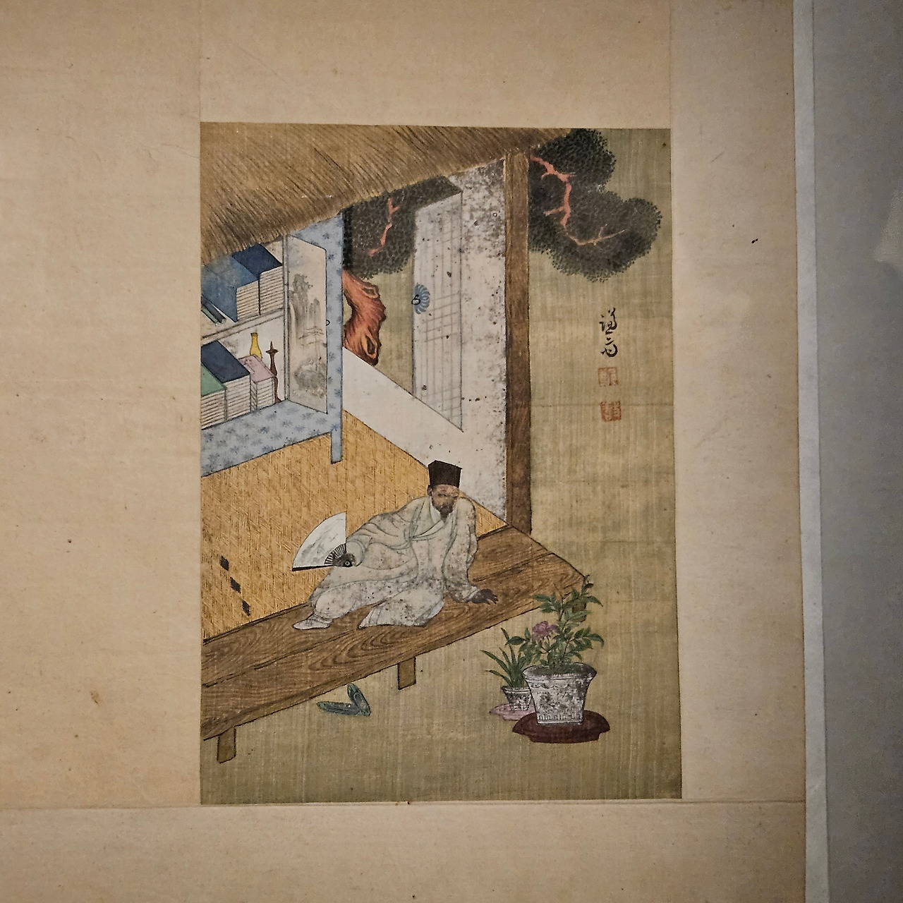 사랑채의 지붕은 기와가 아닌 초가이지만, 창문 넘어 보이는 소나무의 늠름한 자태를 보면 상당한 정원을 가진 집안이지 않을까 하는 의심이 들 정도이다. 그리고 다양한 서책과 정갈한 의복을 보면 상당히 부유한 문인(文人)임을 말없이 알려준다.