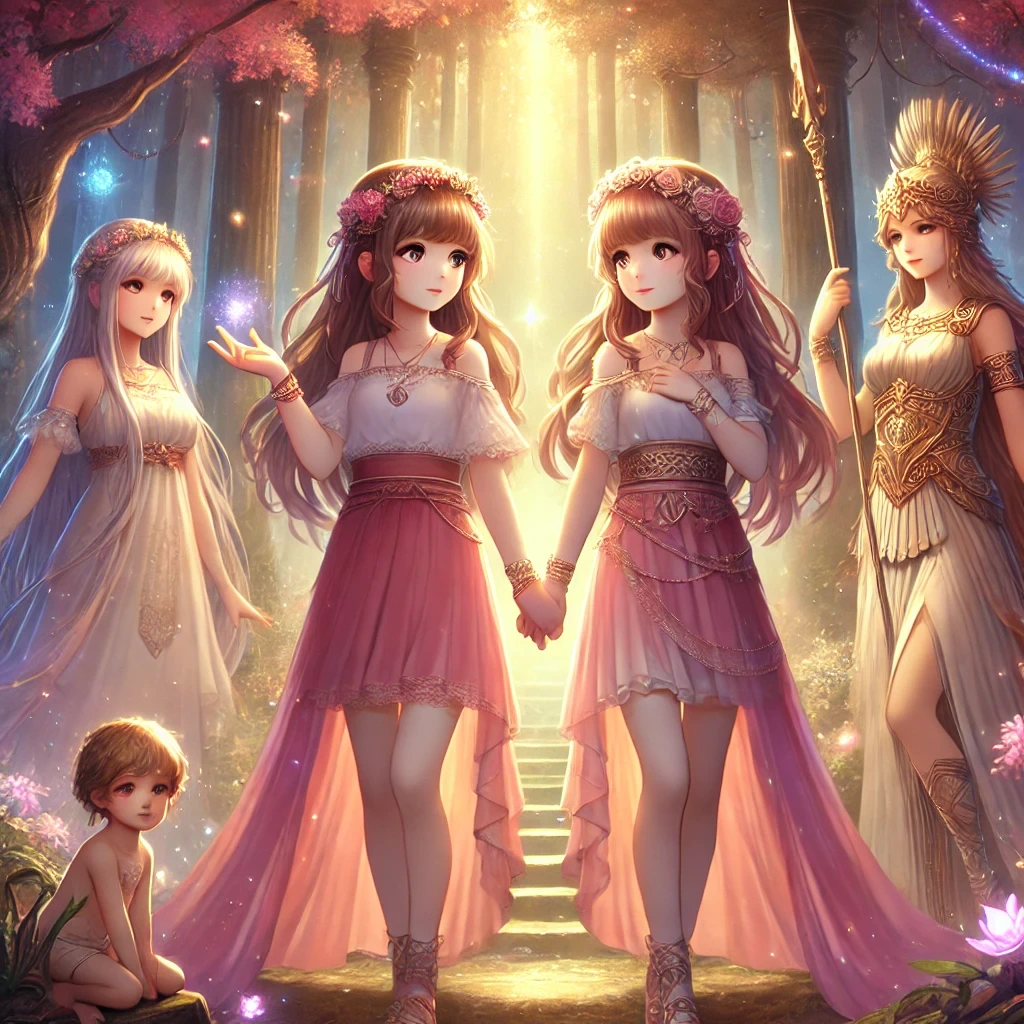 서미와 서아가 사방을 두리번거리며 걸어가자, 아름다운 빛이 번쩍이며 한 여신이 나타났습니다. 그녀는 우아한 미소를 머금고 있었고, 금빛 머릿결이 눈부시게 빛났지요. “너희가 바로 인간 세계에서 온 소녀들이로구나. 나는 미의 여신 아프로디테란다.” 아프로디테가 부드러운 목소리로 인사를 건네자, 서미와 서아는 놀라움에 동그란 눈을 깜빡였어요.