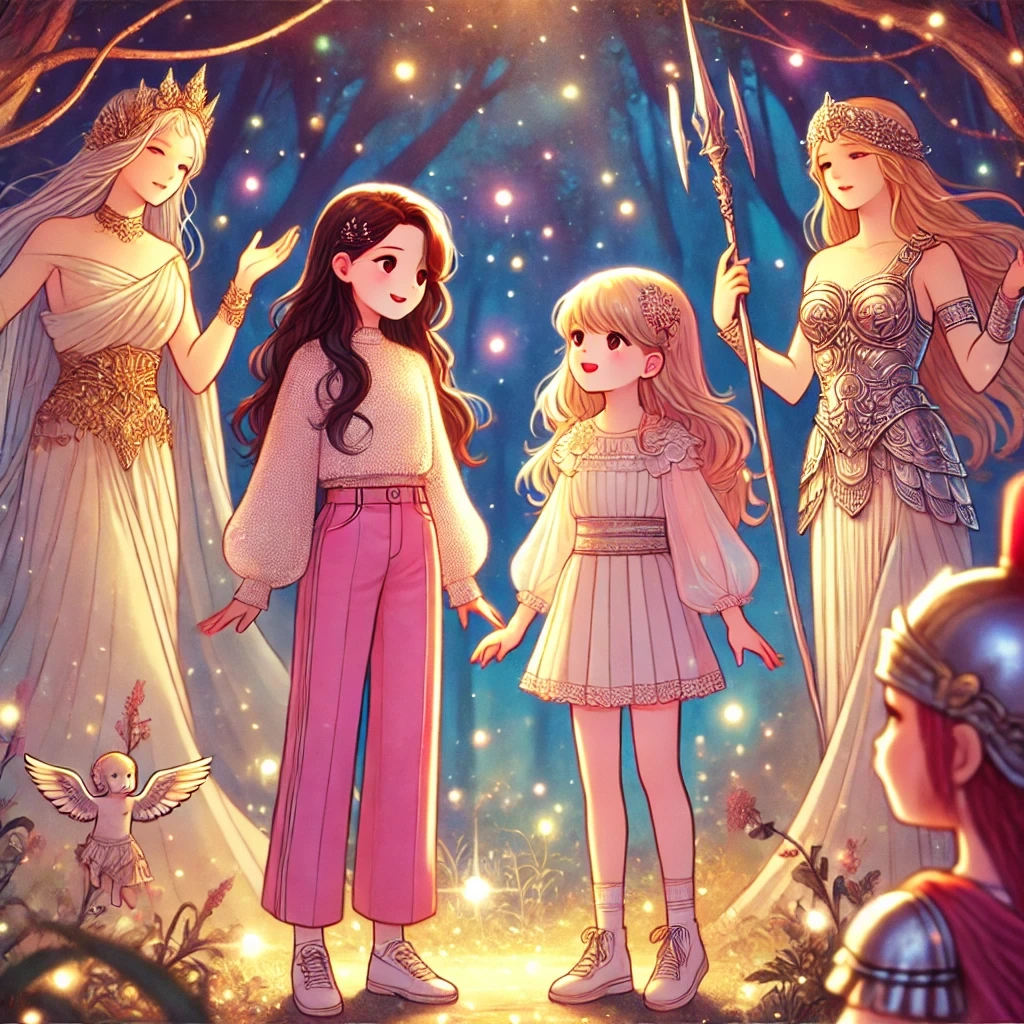 어느 날 저녁, 서미와 서아는 평소처럼 그리스 로마 신화 이야기를 읽고 있었습니다. 갑자기 책장이 환하게 빛나더니, 둘은 순식간에 신비한 숲속으로 떨어졌습니다. 그곳은 바로 ‘올림포스’를 품은 세계였고, 하늘은 은은하게 빛나며 주위엔 신비로운 기운이 가득했습니다.