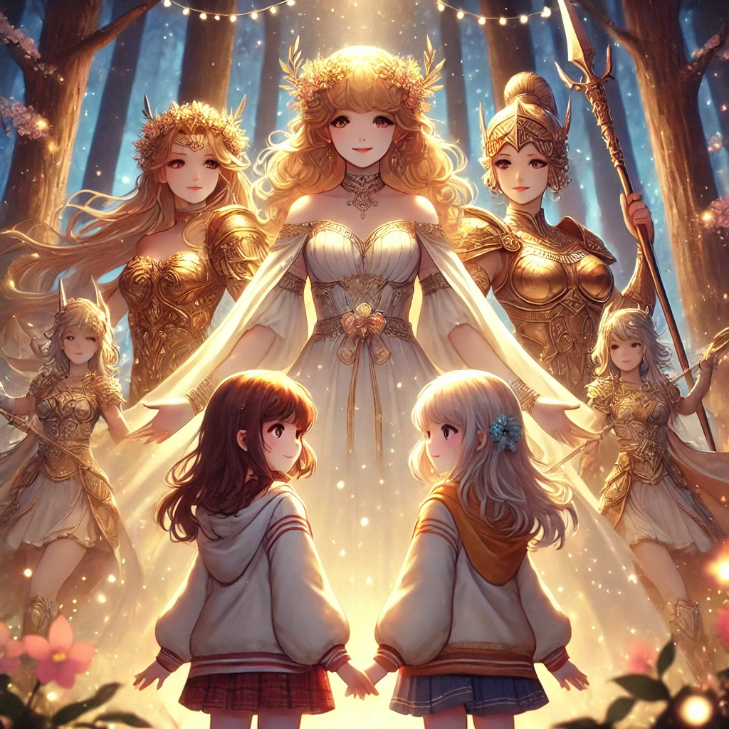 두 소녀는 고개를 끄덕이며 숲을 더 깊이 탐험하기로 했습니다. 조금 더 걷자, 이번엔 위엄 있는 분위기를 풍기는 또 다른 여신이 나타났습니다. 은빛 갑옷을 입고 창을 손에 들고 있는 그녀는 지혜의 여신, 아테나였습니다. “어서 오너라, 내가 너희를 기다리고 있었다,” 아테나가 말을 건네자, 서미와 서아는 긴장되면서도 호기심 가득한 표정으로 다가갔어요.