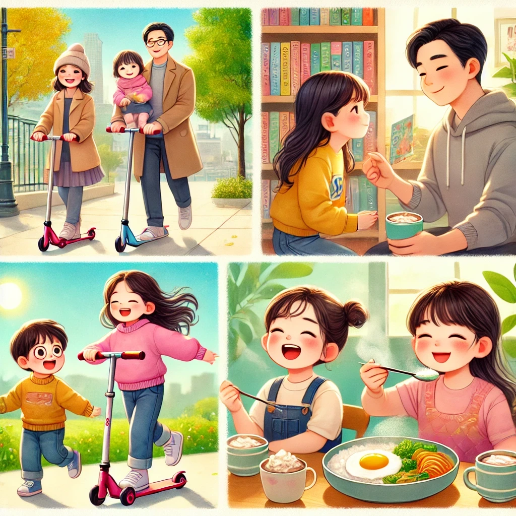 햇살이 따스하게 내리쬐는 주말 아침, 7살 서미와 5살 서아는 킥보드를 타고 공원에 갔다. 엄마, 아빠도 함께였다.