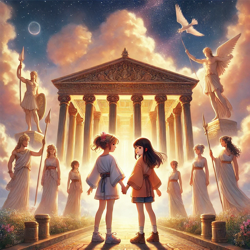 두 자매가 초대장을 펼치는 순간, 눈부신 빛이 퍼지며 두 사람의 몸이 하늘로 붕 떠올랐다. 그리고 다음 순간, 두 사람은 올림포스 신전 앞에 서 있었다.