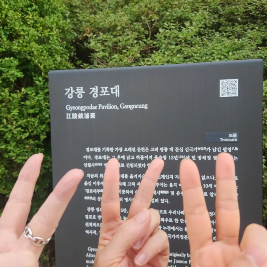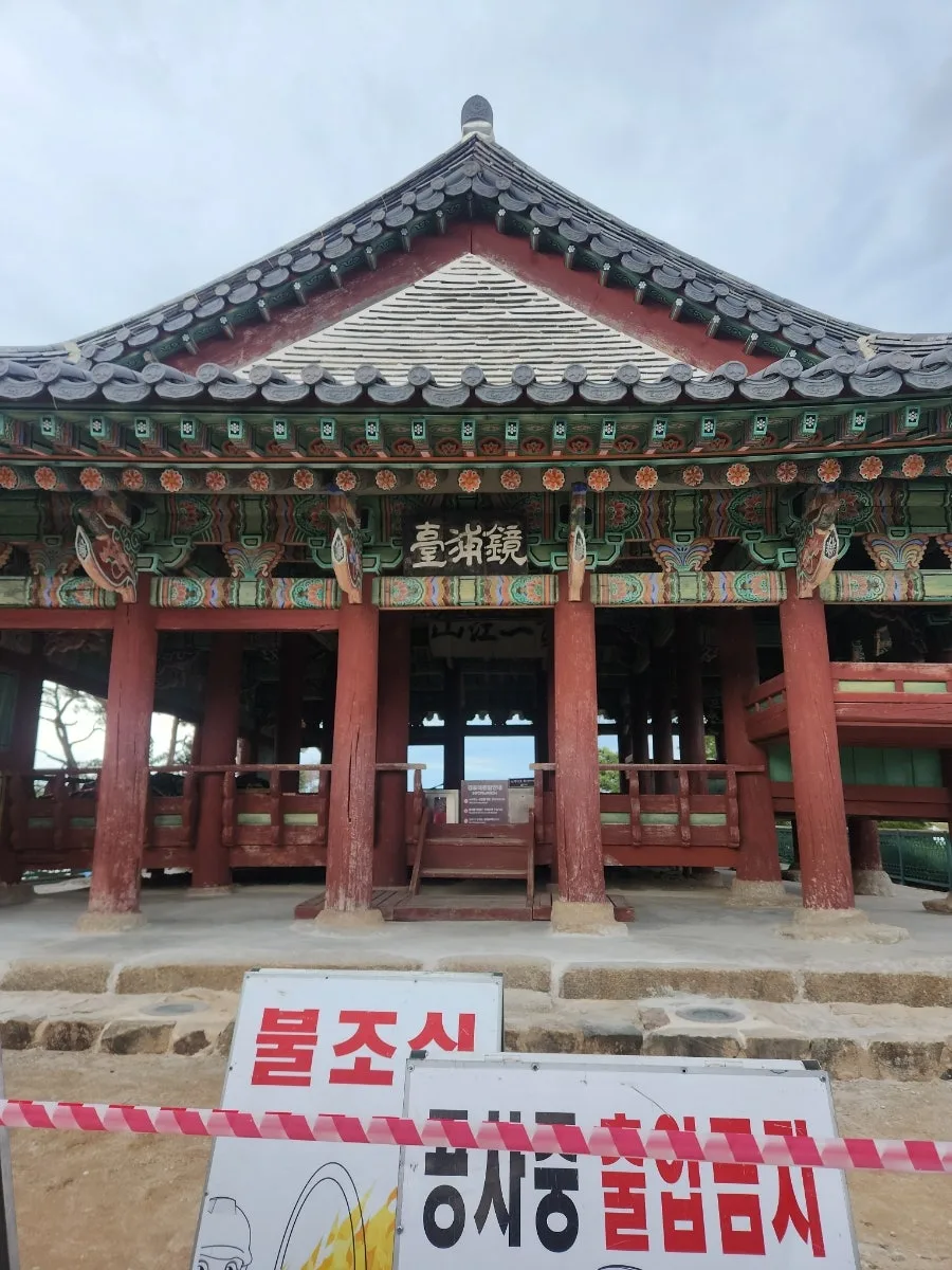 허나 우리가 누구인가. 공사 중이라 쳐 놓은 가림막 사이로 뚱뚱하지도 가늘지도 않은 어중간한 몸을 욱여넣으며 뚫고 들어가 가장 가까운 곳에서 시뻘건 공사 중이라는 간판까지 찰칵 인증하고 나왔다는 것. 내부는 전혀 보이지 않아 경포대 현판만 출연하는 걸로 만족했다. 우리의 불법 행동이 막무가내로 보여 누가 볼까 뒤늦게 부끄러움이 몰려왔던지 후다닥 뛰어내려왔다.