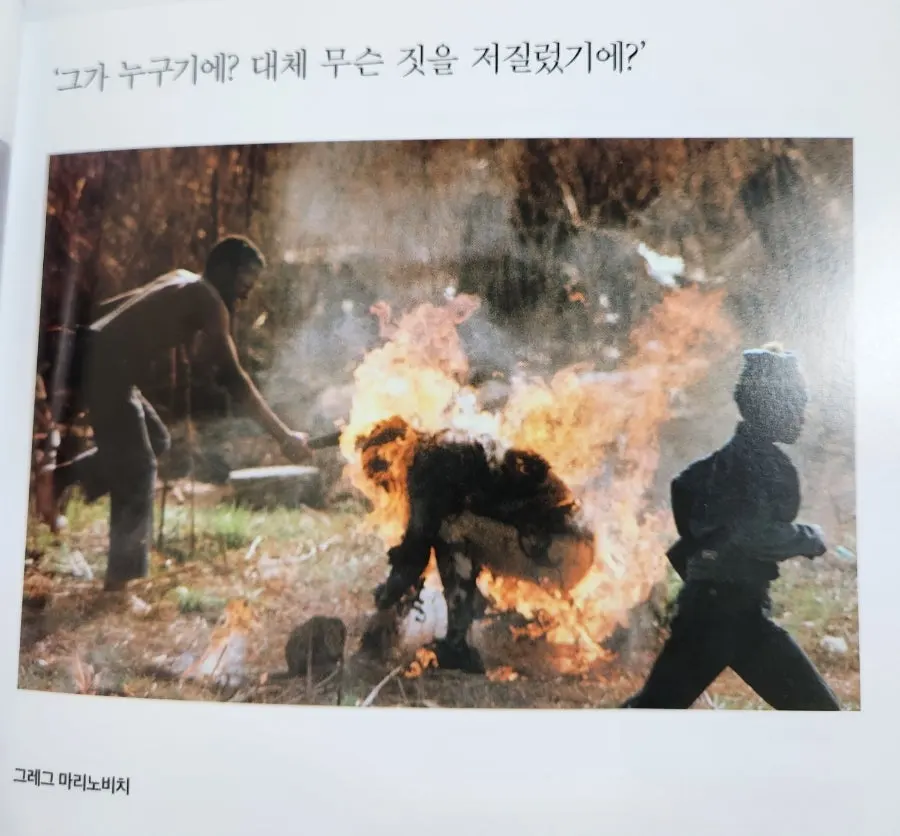 위 사진은 남아프리카 소웨토, 1990년 9월 15일 아직 날이 밝기 전, 그레그 마리노비치와 AP통신 기자 톰 코헨은 아프리카 민족 회의 지지자들과 지배 여당인 줄루인 카타 자유당 지지자들이 벌인 총격적 소식을 접하고 기계적으로 사진을 찍었다 한다. 줄루인은 쓰러져 있었고 죽은 듯이 보였던 남자가 갑자기 온몸이 화염에 휩싸인 채 횃불 같은 모습으로 달려 나가기 시작했다고 한다.