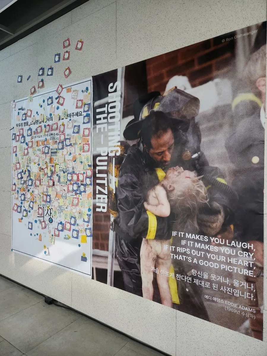 이번 대구 퓰리처전 전시관은 사진 찍는 것은 일부 허용하는데 사람을 넣어서 찍으면 된다고 한다. 찍을까 말까 한참 고민했다. 좀 일찍 도착한 관계로 옆 굿즈 전시관에서 미리 퓰리처 사진전 책자와 노트를 구입한 상태라 전시 사진을 찍지 않아도 됐는데 그래도 사진을 편집해서 올리지만 사실 그것도 소유권을 침해하는 것 같아 불편하기는 마찬가지다.