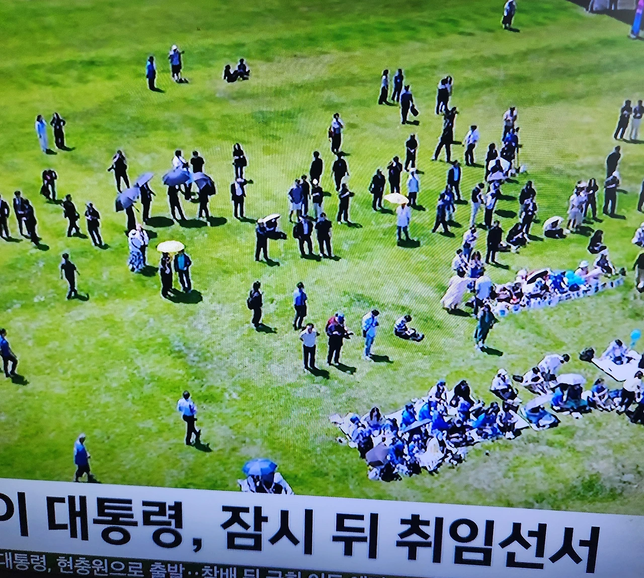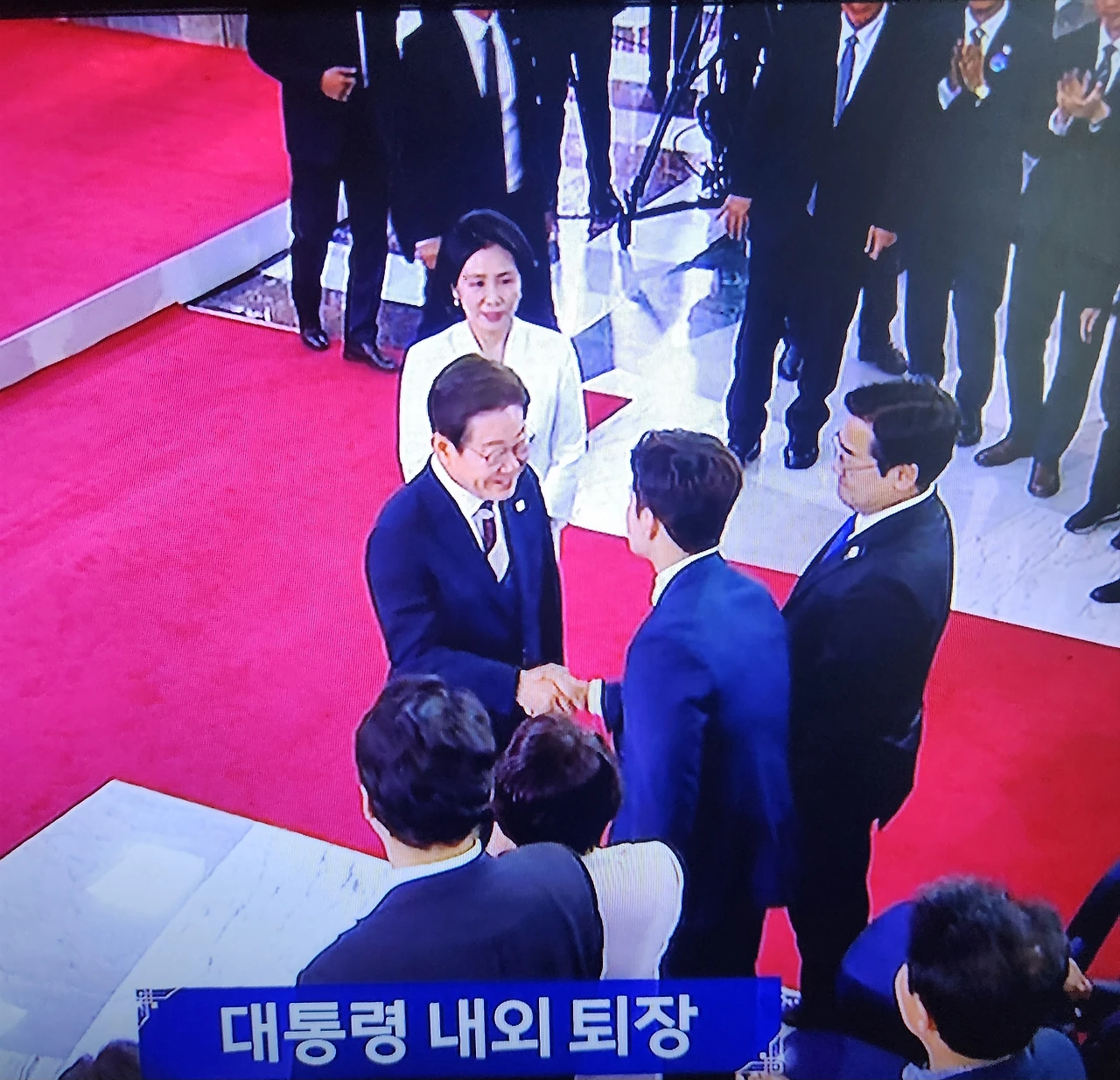 ㅡㅡ취임사를 마치고 젤 먼저 김용태 야당 국민의힘 비상대책 위원장과 악수를 했고 방호 직원들을 만나 위로했고 단식 때 도움을 주었던 청소노동자를 만나 위로하고 격려했다. 노동자를 잊지 않겠다는 의미이며 함께 통합하겠다는 의미로 받아들여진다. 오늘처럼 먼저 손 내밀고 먼저 다가가는 대통령이 되었으면 간절히 바란다. 국회 밖으로 나와 잔디광장에서 기다리던 시민들과 함께 손을 흔들어 주었다.