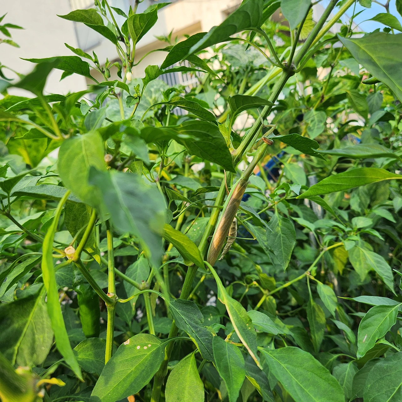 메뚜기와는 먼 종족이라 딱히 천적도 아니라는데. 오히려 바퀴벌레과에 가깝다 하는데 그 녀석처럼 징그럽진 않다. 모양새도 예쁘고 색도 예쁘고 사람이 먼저 덤비지 않으면 해가 없으니 다행이지만 저 녀석이 앞발을 치켜들고 나를 노리는 것 같아 무섭다. 저 녀석이 어디론가 가야 내가 고추를 딸 텐데.