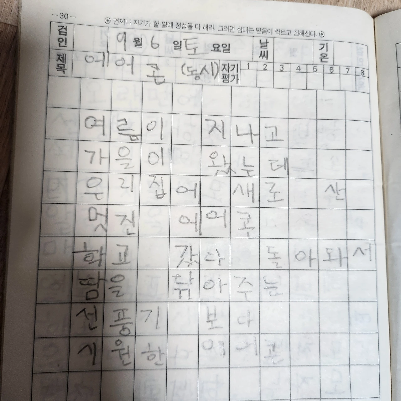 내 손에 잡힌 아이의 일기장은 한여름의 정점이었다. 또박또박 깔끔하고 정확하게 쓰인 글자는 새삼 아이의 무해한 성격을 들여다보고 있는 듯했다. 아마 그가 초등1학년 때 우리는 에어컨을 샀나 보다.