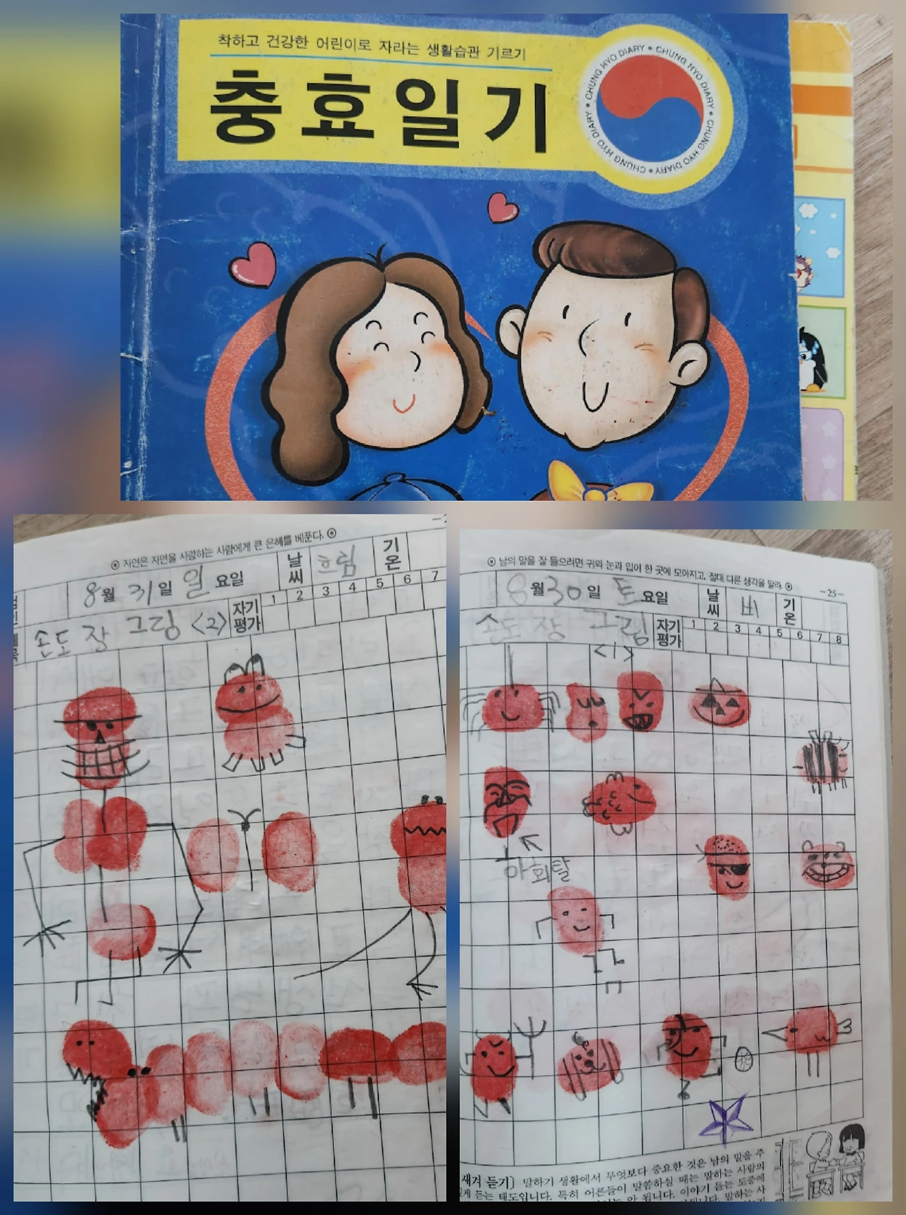 내 아이들이 초등학교를 다닐 땐 충효일기를 썼다. 지금은 거의 사생활을 노출하는 것이라 하여 쓰지 않는다고 하지만 그때는 매일매일 써야 했고 매일매일 선생님께 검사를 받아야 했다. 아이들의 일기 숙제는 곧 엄마의 숙제가 되기도 했다. 것이 마땅찮은 날엔 여러 가지 방법으로 하루의 일과를 메꿔야 했다. '손도장 그림'도 어떤 책을 보고 영감을 얻어 아이에게 해 보라 했던 작품인데 그때는 신선했다.