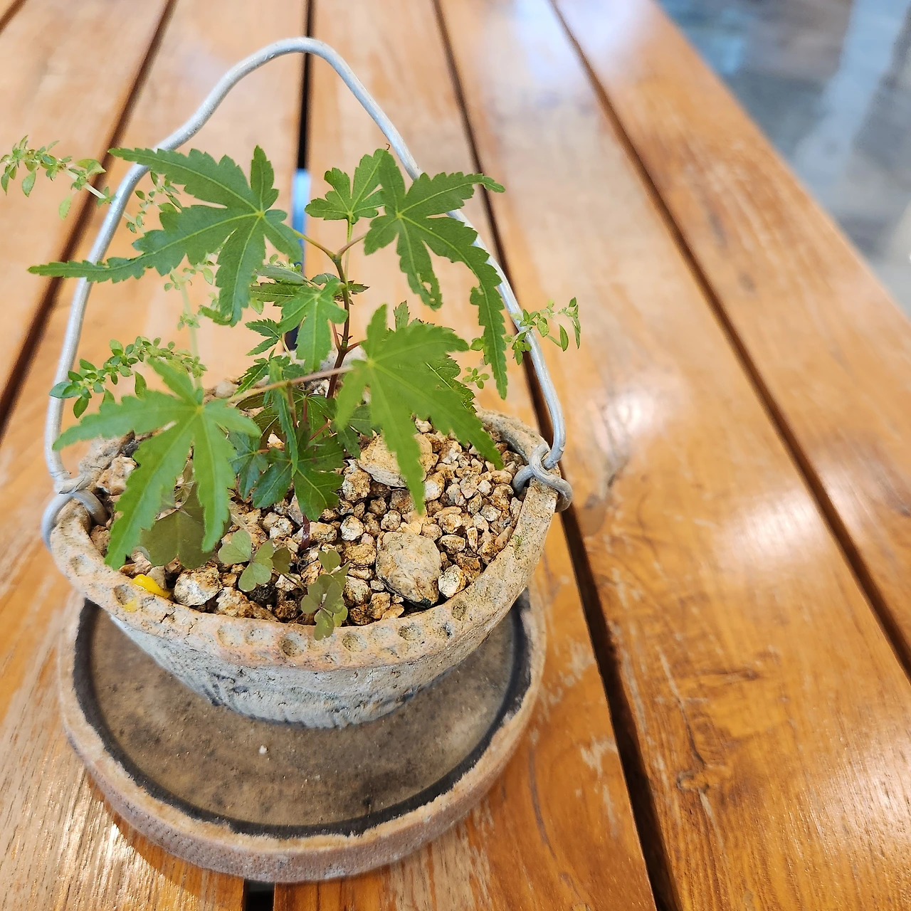단풍잎과 닮은 초록의 잎이 탁자 모서리 한편에 자리 잡고 앉아 나를 쳐다본다.