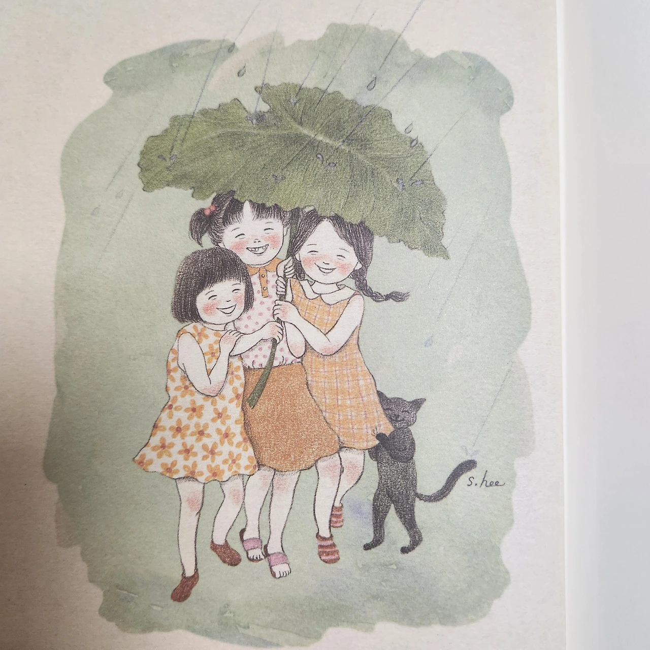 연잎을 따다 비를 피했지요. 갑자기 만난 소나기를 어떤 날은 피하기는커녕 그대로 맞았던 날도 있지요. 홀딱 맞아도 기분 좋았습니다. 엄마가 혼을 내도 기분은 좋았지요. 사진 속 그녀들처럼 깔깔거리며 즐거웠어요. 지금의 그 친구들이 하나는 ㅇㅇ에 하나는 ㅇㅇ에 살고 있지요. 일 년에 두세 번 함께 만나는 그리운 얼굴이지만 늘 마음만은 깔깔거리며 웃고 지내지요. 비에 젖는 건 힘든 일이 아니니까요. 그땐 뭘 해도 즐거웠어요.