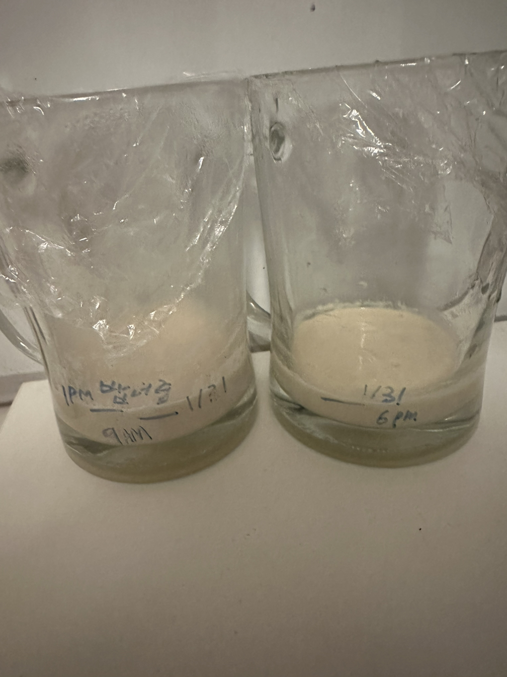 밤늦게 집에 오면 밥 줄 타이밍을 놓칠 것 같아서 6시에 따로 덜어 키운 반죽에 첫 밥을 주었다. 아직도 좀 묽고 부풀지 않는데 별문제 없이 잘 자라주면 좋겠다. 매일 밥을 준 왼쪽의 반죽도 오후 한 시 이후로 큰 변화가 없다. 3-4일 차에 효모가 생성되며 온다는 위기가 지금인 것 같다.