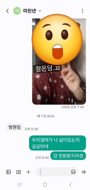 딸아이가 전화를 걸었지만, 친구는 전화를 받지 않았다. 그리고는 ‘병원임’이라는 짧은 문자가 왔다. 옆에서 딸에게 문자를 남겨보라 했다. 우리 엄마가 괜찮냐고 걱정한다고. 알겠다고 딸아이는 난중 답장 오면 알려줄 테니 나보고 나가라고 했다. 근데 갑자기 딸이 의심스러운 나는 휴대전화기를 빼앗아 문자를 확인했다.