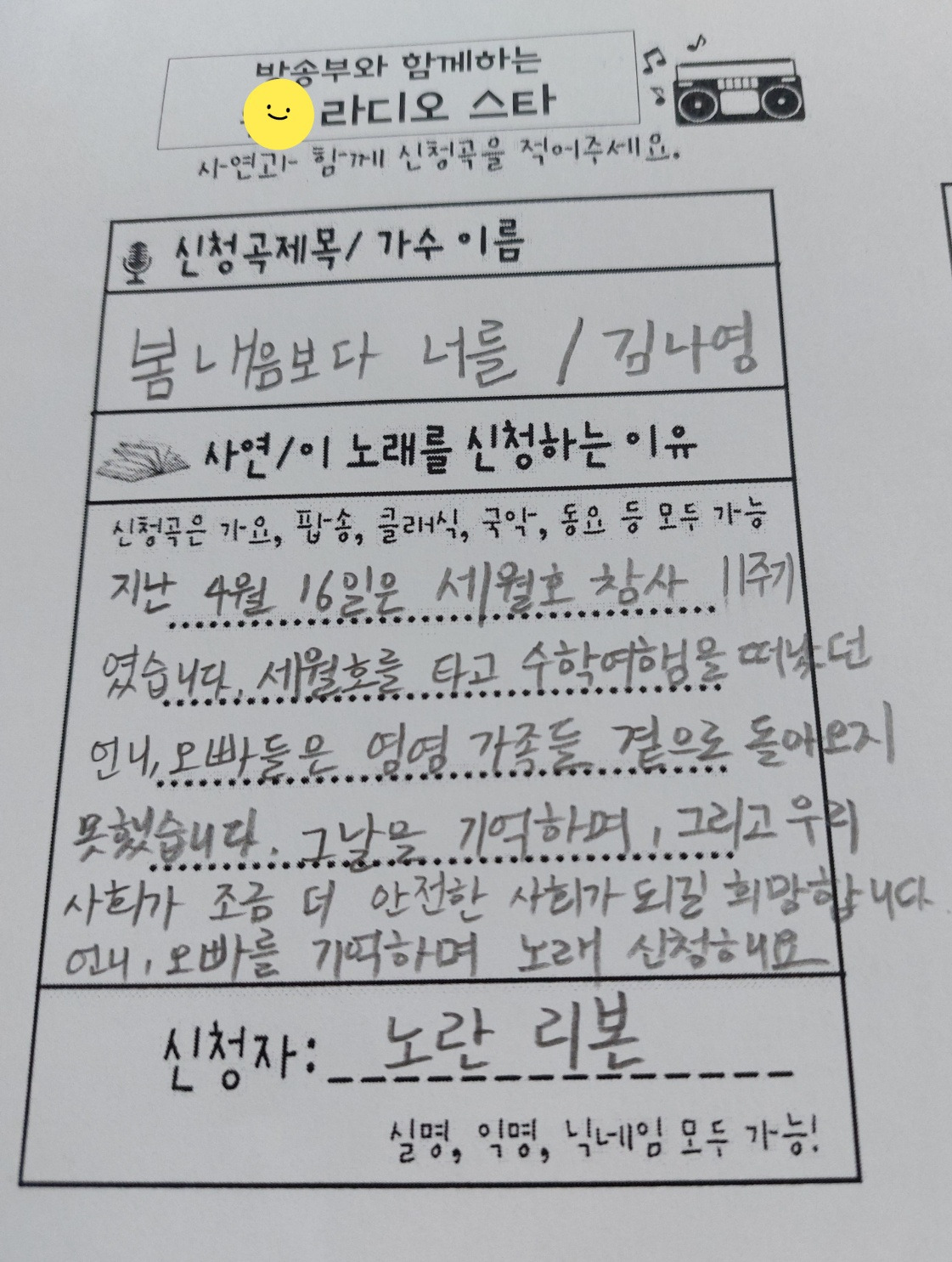 앗, 그날 퇴근하면서 차에서 생각했다. ‘내일 학교 가서 라디오스타 신청곡 써야지’ 목요일 오전 아이들이 과학 수업 가고 없을 때 몰래 신청 종이에 사연과 곡명을 작성했다. 너무 어른 글씨가 티가 나면 안되니까 왼손으로 써 볼까 했는데 그냥 평상시 글씨로 썼다. 어차피 6학년은 이제 우리 반 아니라서 내 글씨 모를 거야.