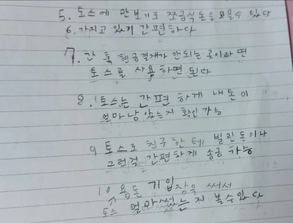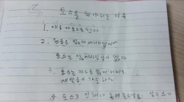 집에 와서 선심 쓰듯 아들에게 이야기했다. 네가 토스 카드가 필요한 이유 10가지를 종이에 적어 오라고 말입니다. 흥분한 아들이 방에 들어가서 글씨를 갈겨써 왔네요.