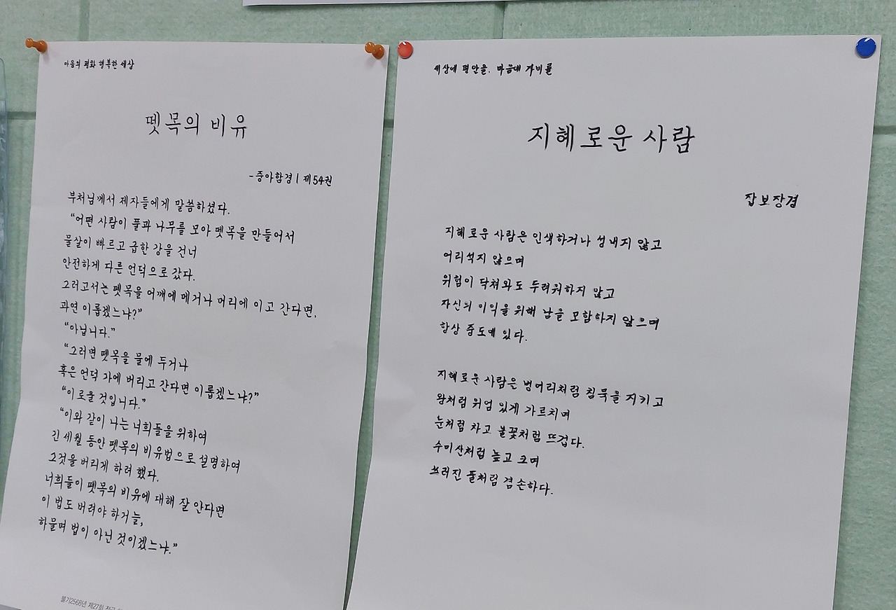 오늘 아침 학교에 간 나는 부처님의 좋은 말씀을 널리 알리기 위해 연구실 게시판에 붙여 놓았다.