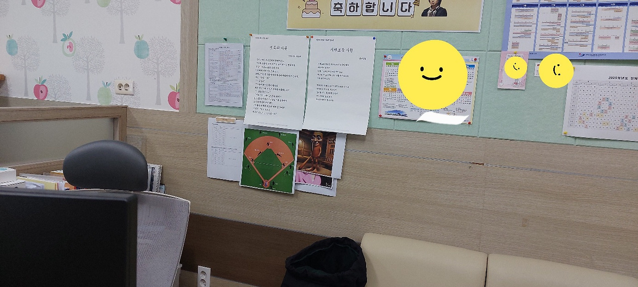 원래 이런 용도가 아니긴 하지만 딱히 지금 더 게시할 것도 없었다. 아침 일찍 온 4학년 선생님은 “음 부처님의 가르침이 담겨 있군요! 두 번 정도 읽어야 이해되겠어요 ”라며 나에게 이야기해 주었다. 그다음 들어온 나의 대학 동기 오빠 연구부장님(체육선생님)은 나의 심오한 선물에 나름 만족해하는 것 같았다. 참고로 2층 연구실은 연구부장님의 연구공간이면서 교사휴게실 역할을 하고 있다.