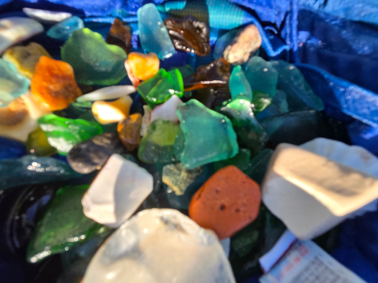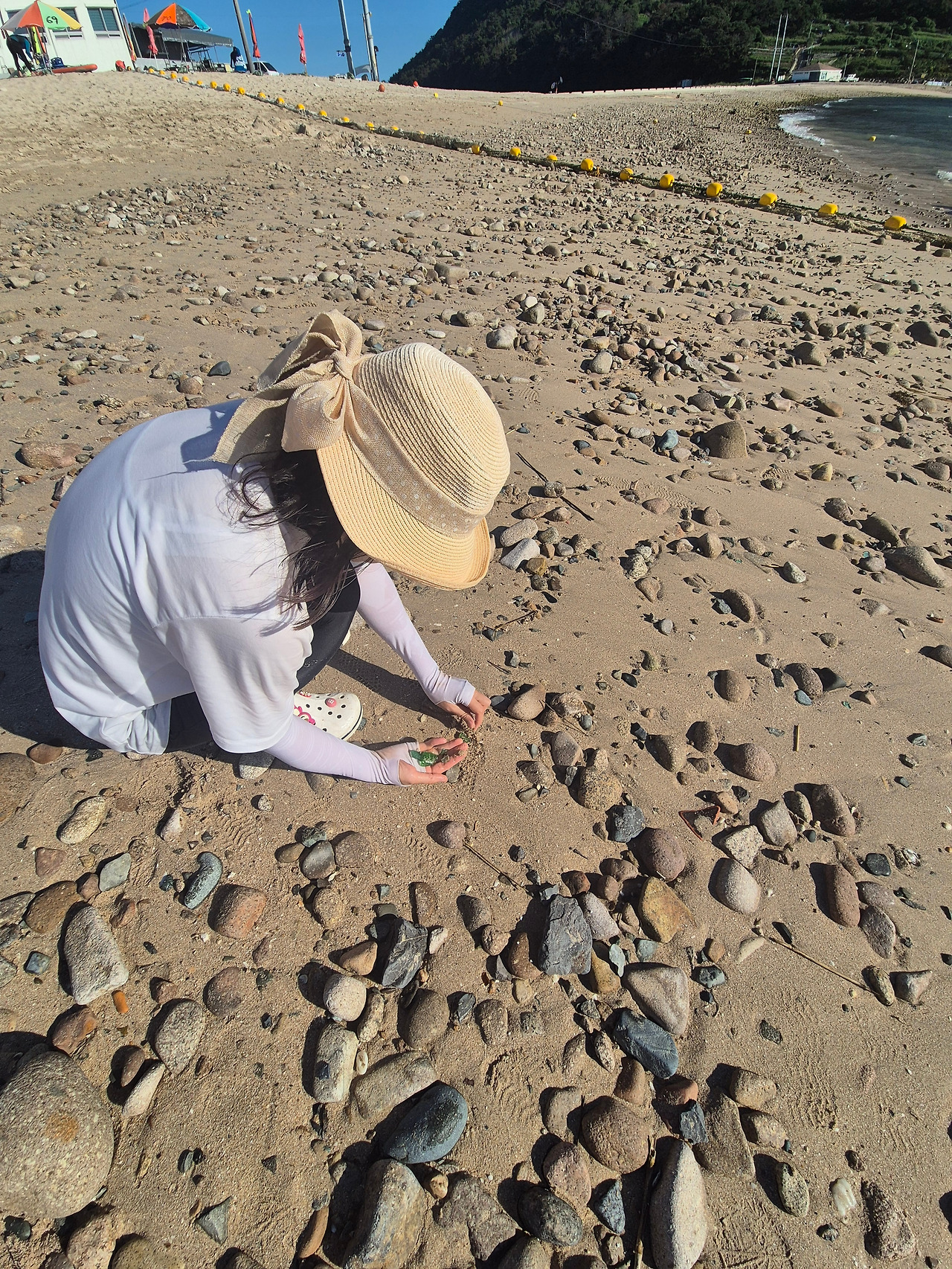 남편과 아들이 수영을 즐기는 동안 딸아이와 나는 해변에 앉아 있었다. 그 순간 내 눈에 반짝이는 게 보였다. 그건 바로 다이아몬드가 아닌 바다 유리(씨글라스)였다. 파도에 깎인 바다 유리는 둥글둥글 예뻤다. 개학하면 아이들과 바다 유리를 활용해 미술 활동을 계획했던 나는 만세를 불렀고, 보석을 줍는 심정으로 유리를 주웠다. 딸 아이와 30분 넘게 주웠는데 충분한 양을 구해서 숙소로 돌아왔다.