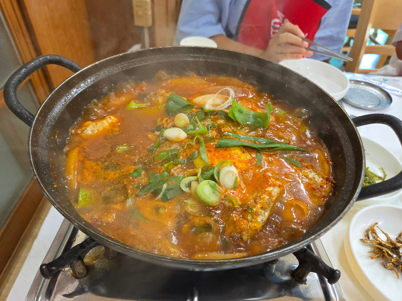 12시 30분쯤 나와서 근처 식당으로 갔다. 아, 평일인데 대기줄까지 있어서 포기하고 여객선 터미널 근처 식당을 물색했다. 네비를 따라서 돌다가 우연히 풍자의 또간집 현수막이 달린 식당을 보고 들어갔더니 사람이 별로 없었다. 우리는 갈치조림과 생선구이를 배부르게 먹었다. 남편은 최근래에 먹은 갈치조림 중에서 최고라고 했다. 1시 40분쯤 나와서 나는 여객선터미널에 티켓 발권을 하러 뛰어갔고, 남편은 아이들과 근처의 하나로마트에 고기와 먹거리를 사러 갔다. 하나로마트에서 물건을 사면서 배에 물건을 실어달라고 하면 그렇게까지 해준다고 블로그에서 봤지만 우리는 우리가 들고 갔다. 다행히 남편은 2시 5분쯤 도착했고 우리는 무사히 2시 30분 배에 올라탔다. 진짜 빈자리 없이 손님이 가득 탔다.