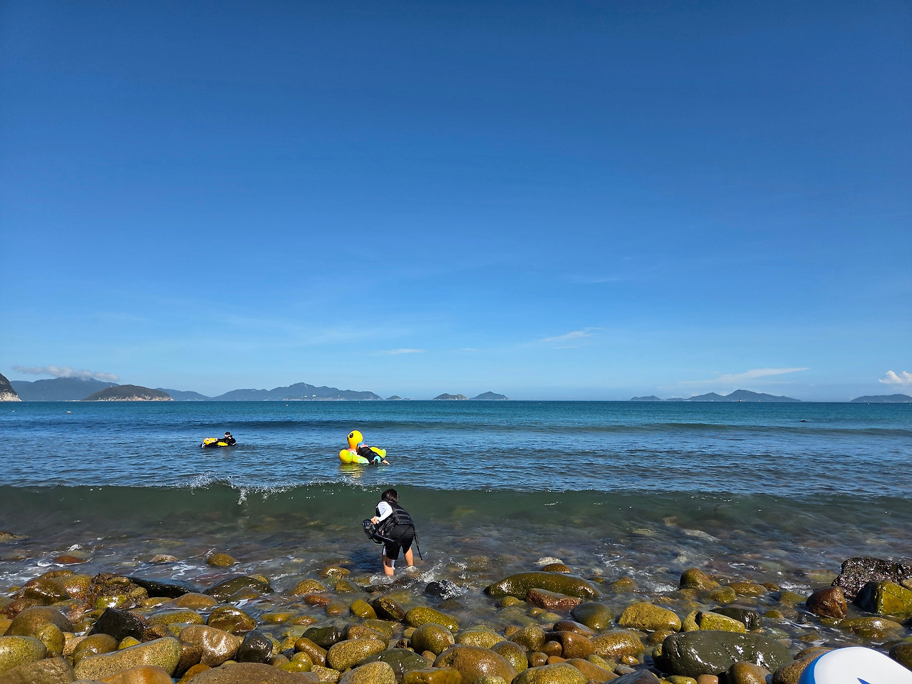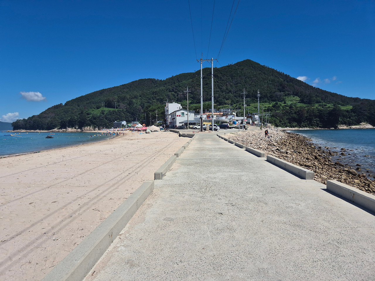 50분쯤 달려 비진도 외항에 도착했다. 펜션 사장님이 트럭을 가지고 나오셔서 짐을 실어주시고 우리도 트럭을 타고 숙소에 갔다. 생각보다 숙소는 많이 낡은 상태였고, 한숨이 나오기도 했다. 빨리 옷을 갈아입고 물놀이를 하러 갔다. 신기하게도 우리 숙소 앞은 몽돌이 있는 바다였고, 맞은편은 모래사장이 있는 해수욕장이었다. 아이들은 모래가 없는 몽돌에서 놀기를 희망해 그쪽에서 놀았는데 파도가 너무 세서 겁이 났다. 나중에 나오면서 알았다. 물놀이 금지 표지판이 있었다는 걸 말이다. 튜브를 이고 다시 반대쪽 해수욕장으로 갔다. 우리가 늦게 도착해서 그런지 사람들이 별로 없었다. 당일치기로 섬에 들어온 사람들은 배를 타러 줄줄이 나가고 있었다. 모래 해변에는 폭우에 떠내려온 지푸라기와 나뭇가지, 일반 쓰레기가 많이 보였고 물도 생각보다 흐렸다.