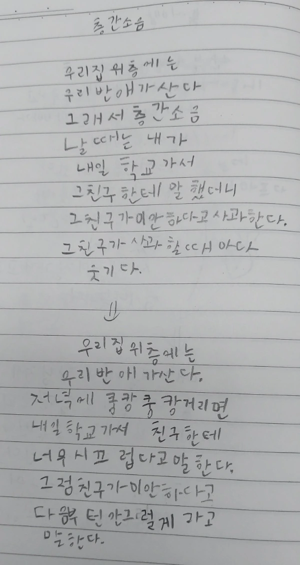 벌써 수업 시간은 막바지에 다다랐고 아들은 대충대충 시를 완성했습니다. 자기도 그걸 아는지 발표하는데 목소리가 평소보다 작습니다. 선생님께서도 매우 아쉬우신지 오늘은 뒷이야기가 짧으시네요.