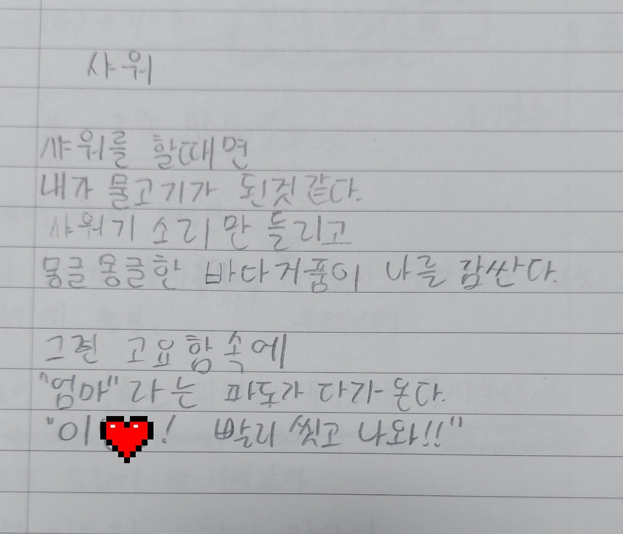 반면 남편과 12살 딸아이는 샤워 시간이 상당이 길다. 남편과 딸은 욕실에 들어가면 기본이 20~30분이다. 하~문제는 중간중간에 물을 꺼도 되는 타이밍에도 절대 샤워기를 끄지 않는다는 것이다. 그래서 나는 그 둘이 욕실에 들어가면 화딱지가 난다.