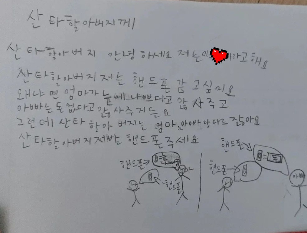 당시 4학년이던 딸아이는 산타는 없다며 엄마 아빠가 선물 준비해서 주는 거 다 안다면서 제법 큰 애처럼 굴더니만 결국에는 자기도 그 주머니에 편지를 써넣고 말았다. 딸아이의 희망 선물은 크게 특별한 것도 아니라서 우리가 충분히 사줄 수 있는 것이었다. 하지만 아들의 강력한 편지 덕분에 딸의 편지는 하나도 기억이 나지 않는다. 휴대폰 휴대폰 노래를 부르던 아들은 기어코 산타에게 휴대폰을 달라며 간절한 편지를 쓰고 말았다.