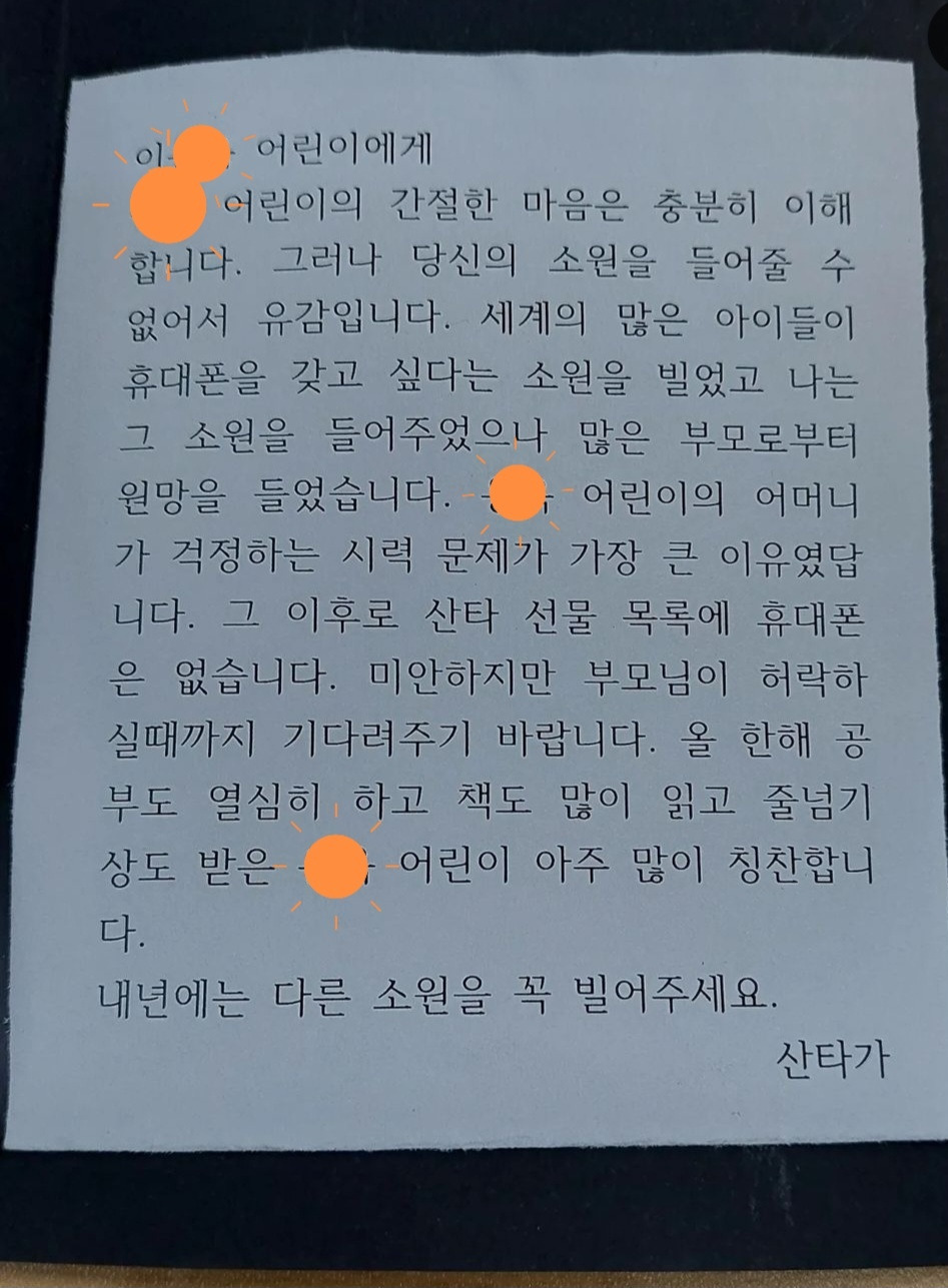 남편과 나는 비상 대책 회의를 소집했으나, 강력한 나의 반대에 핸드폰을 사지 않기로 결정했다. 그 대신 내가 아들에게 산타인 척 휴대폰을 선물로 줄 수 없는 이유에 대해 편지를 쓰기로 했다. 그때까지 우리는 아들의 반응을 전혀 예상하지 못했다. 뭐 조금 섭섭해도 담담히 받아들일 줄 알았다.