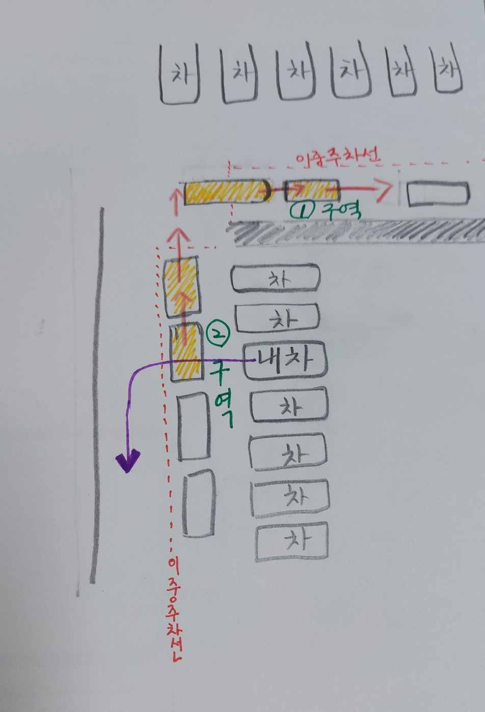 ①구역에 있는 차 2대를 밀었다. 남편이 뒤에서 밀고 나는 앞차랑 부딪치지 않게 간격을 봐주고 있었다. 그러고 나서 ②구역의 차를 2대나 더 밀어야 했다. 남편은 계속 나보고 차를 타서 시동 걸고 갈 준비를 하라고 채근했다. 그런데 걱정이 많은 나는 남편이 미덥지 못하다. 혹시나 힘 조절을 못해서 이중 주차 차량이 박치기할까 봐 촉각을 곤두세우고 있다.