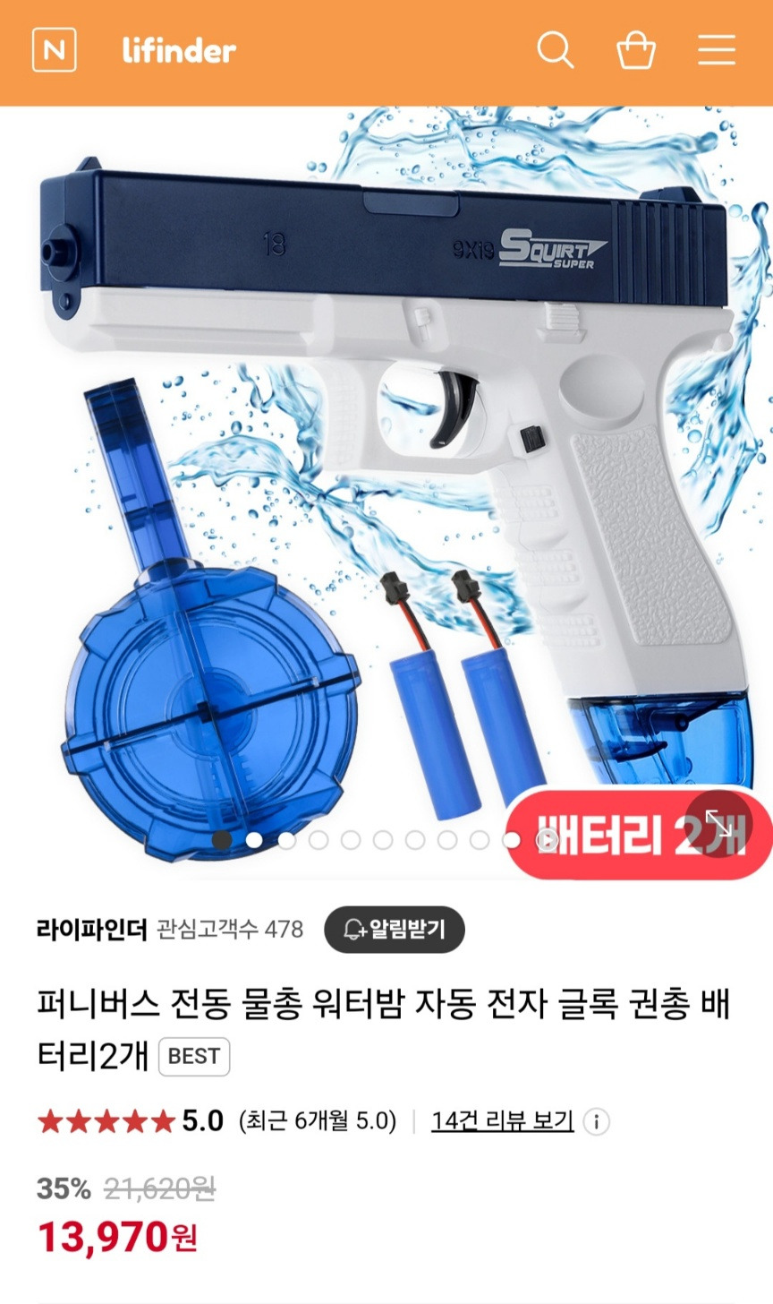 아들이 약속을 이행했으니 물총을 주문해 주기로 합니다. 세상 좋아졌습니다. 희한한 물총이 다 있네요. 가격은 13000원입니다. 택배비까지 하니 15000원이 넘습니다.