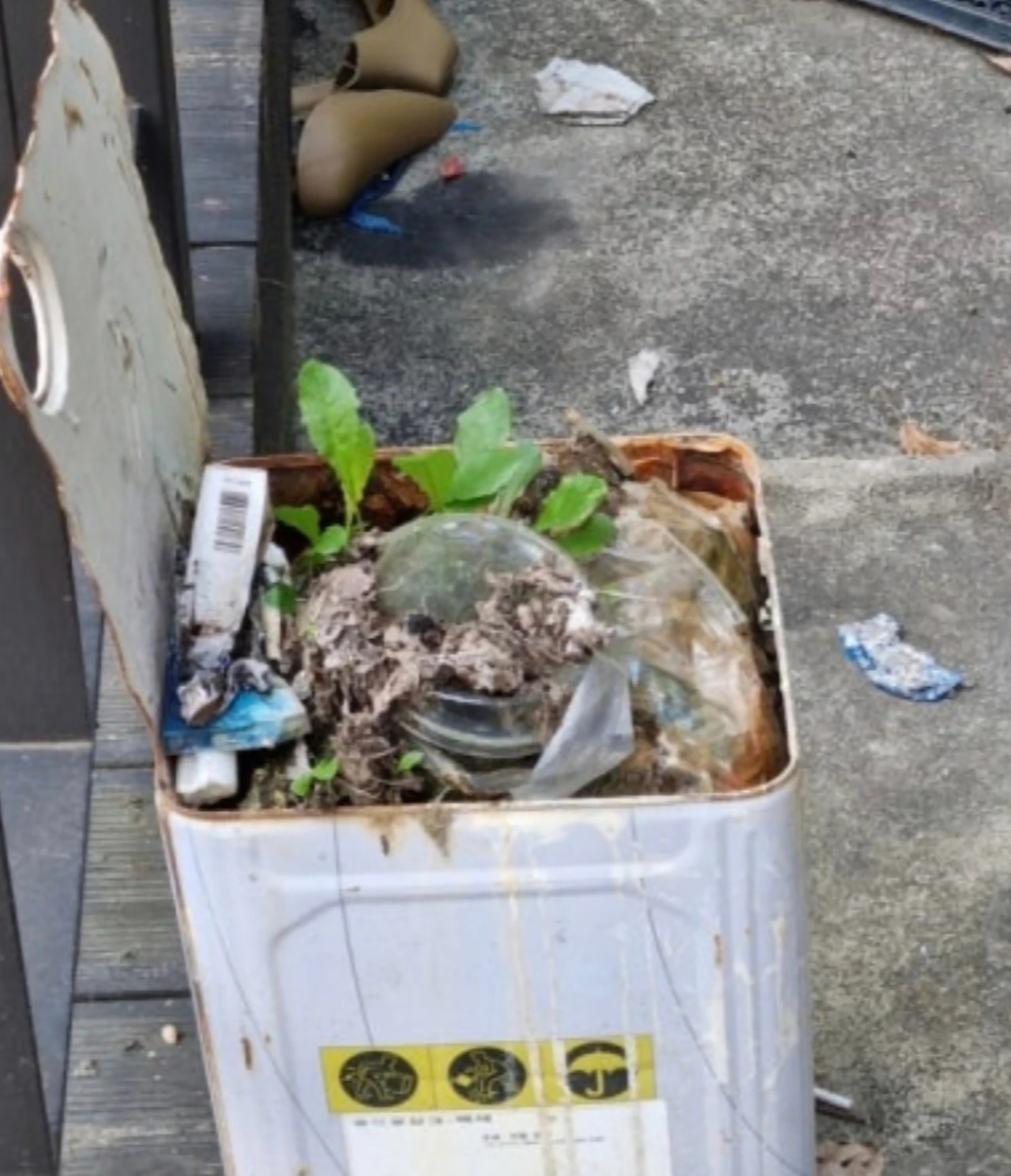 재활용품 더미 옆에 쓸쓸히 놓인 화분 하나.