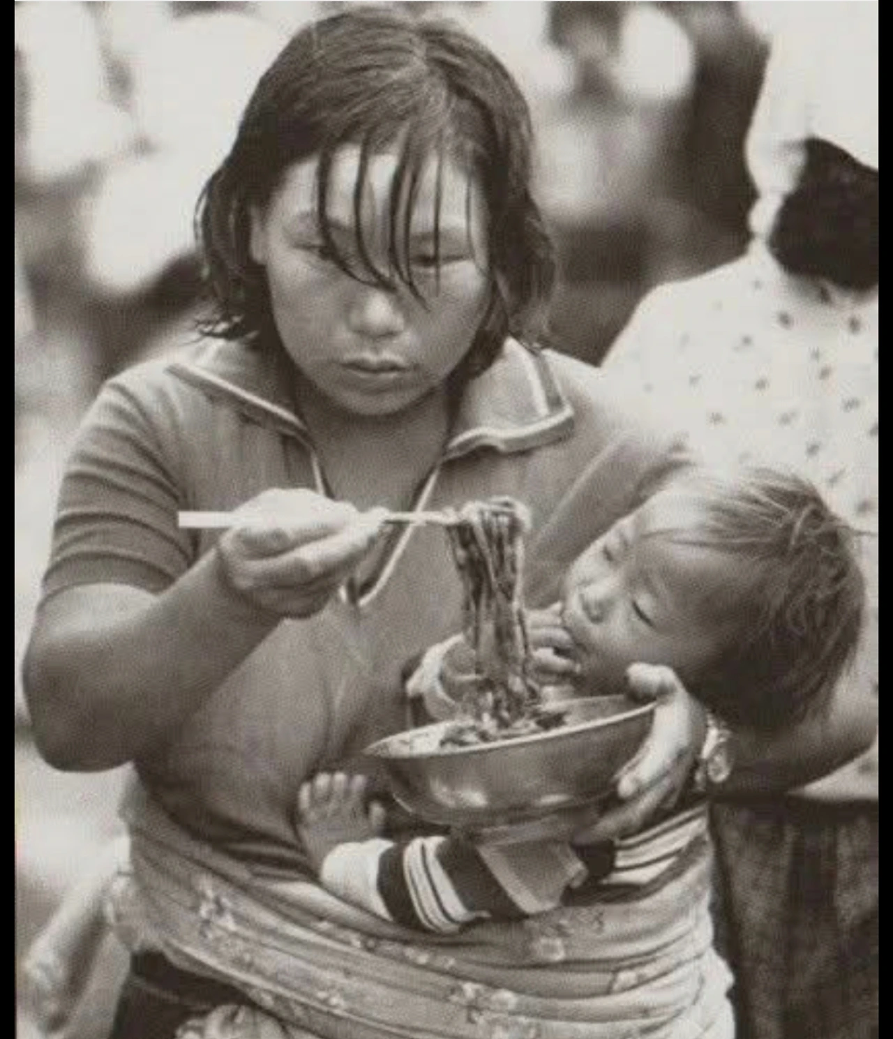 엄마는 아이를 등에 둘러업고 있다.