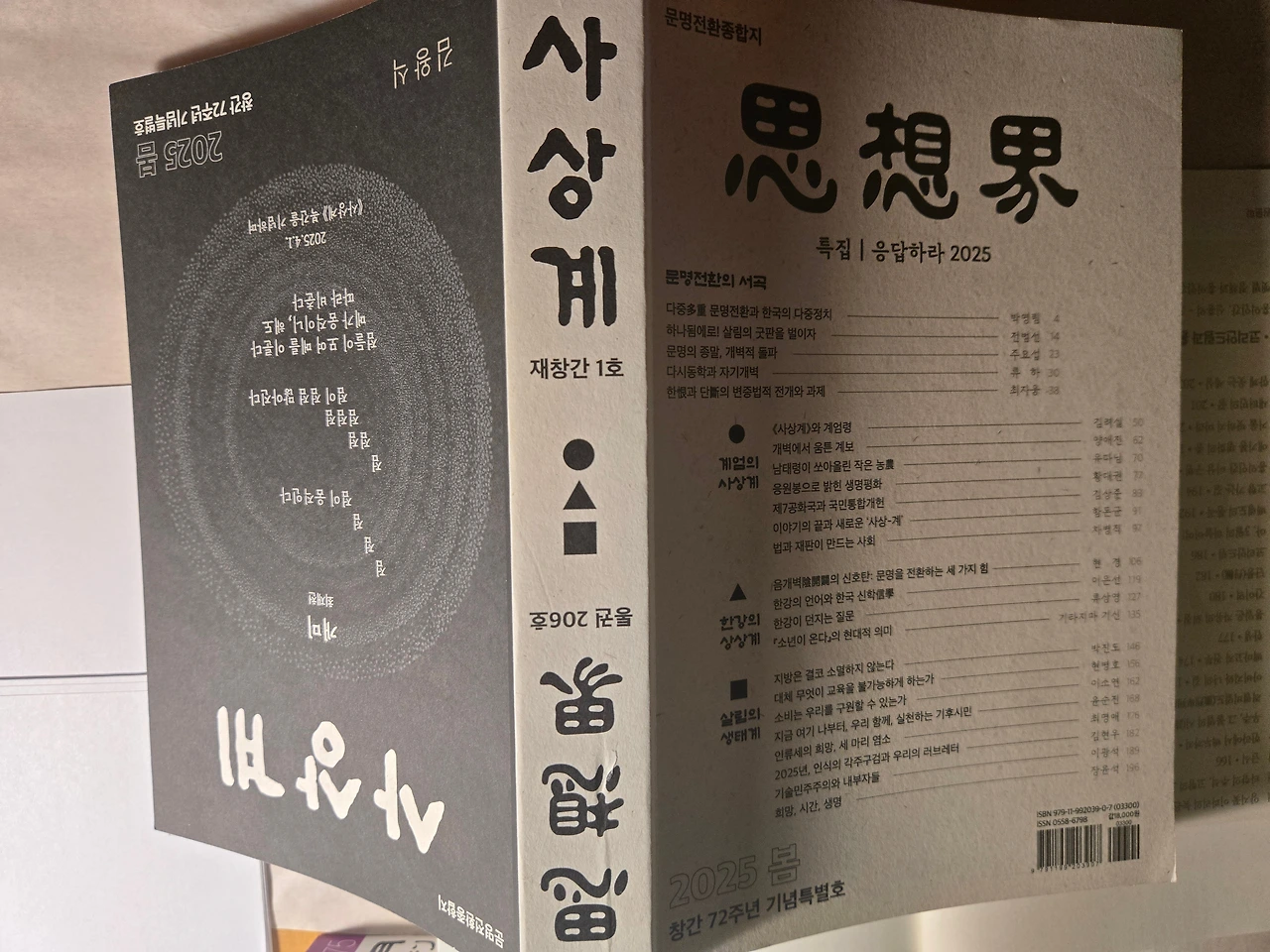 2025년은 사상계 창간 72주년이 되는 해이기도 하다. 이를 기념하여 복간호는 특별한 형식으로 탄생했다. 총 1000권 한정본으로 출간된 이번 사상계는, 양면으로 표지를 두어 앞과 뒤에서 거꾸로 읽을 수 있도록 구성되었다. 한쪽은 과거의 지성과 역사를, 다른 한쪽은 미래를 향한 제안과 성찰을 담고 있다. 더욱 놀라운 점은, 이 책이 세계 최초로 ‘각각의 독자 이름’을 표지에 명기한 퍼스널 에디션으로 제작되었다는 사실이다. 이는 단지 책의 소유를 넘어, 각 독자가 이 시대의 사상계에 함께 참여하는 일원임을 상징한다. 책이 독자에게 말을 거는 것이 아니라, 독자가 책의 일부가 되는 혁신적 구성이다.