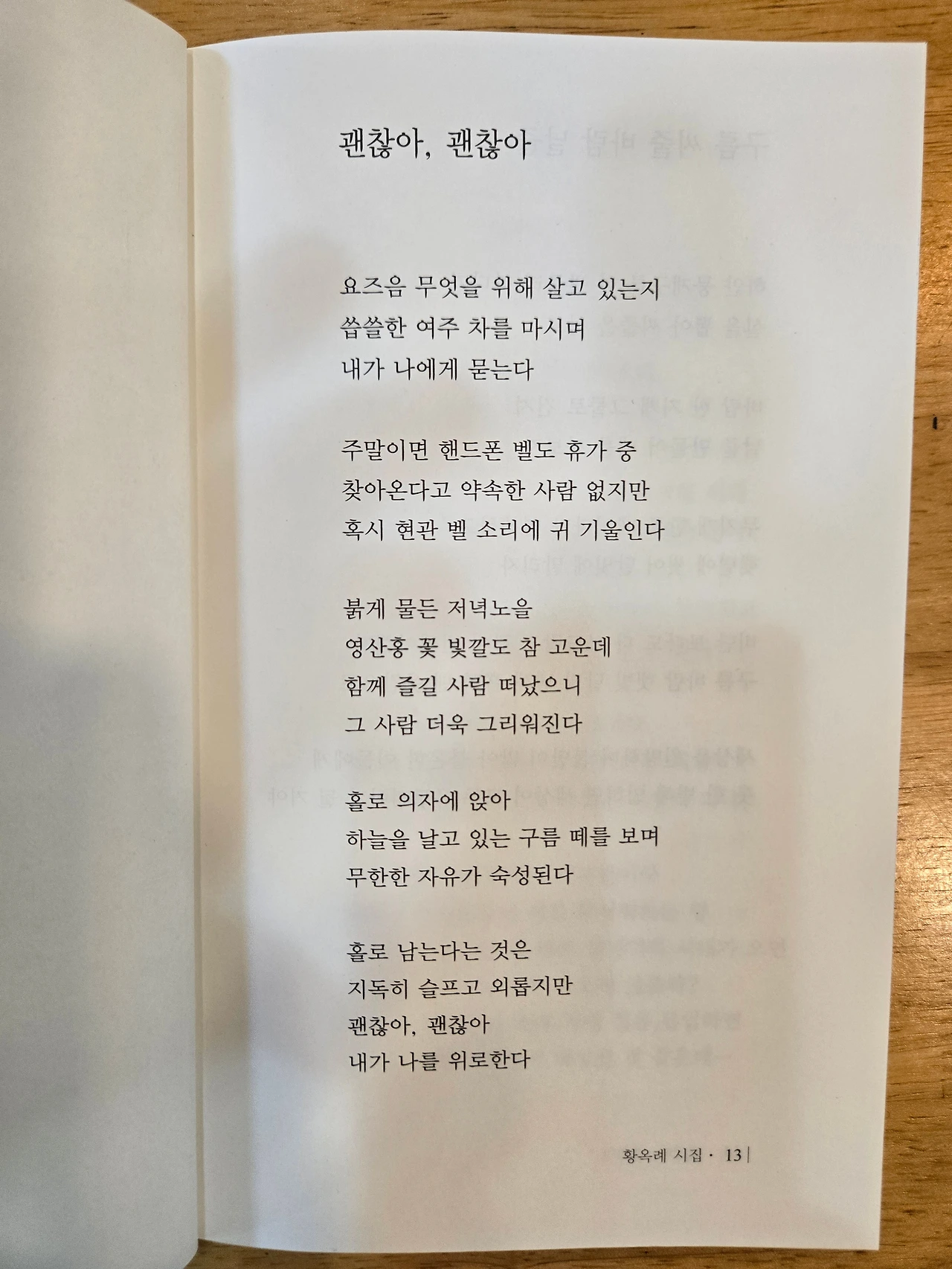 황옥례 시인의 시 〈괜찮아, 괜찮아〉는 마치 생의 황혼 무렵, 누구에게도 기대지 않고 조용히 삶을 돌아보는 한 어머니의 마음을 투명하게 담아낸 작품이다.