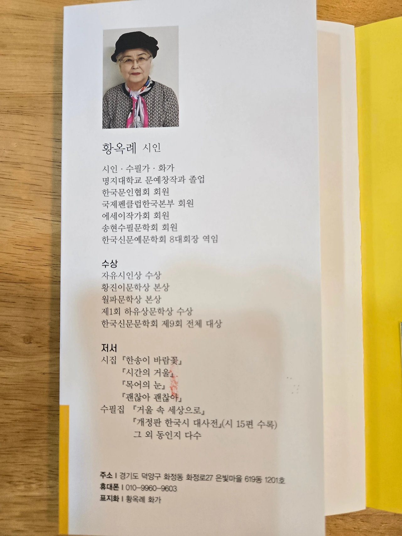 이 구절에서 시인의 인생철학이 절절하게 드러난다. 고독은 견딜 수 있는 것이며, 외로움은 끌어안을 수 있는 감정이라는 믿음. 황옥례 시인은 그 믿음을 시로 써 내려가며, 우리에게 조용하지만 강한 위로를 건넨다.