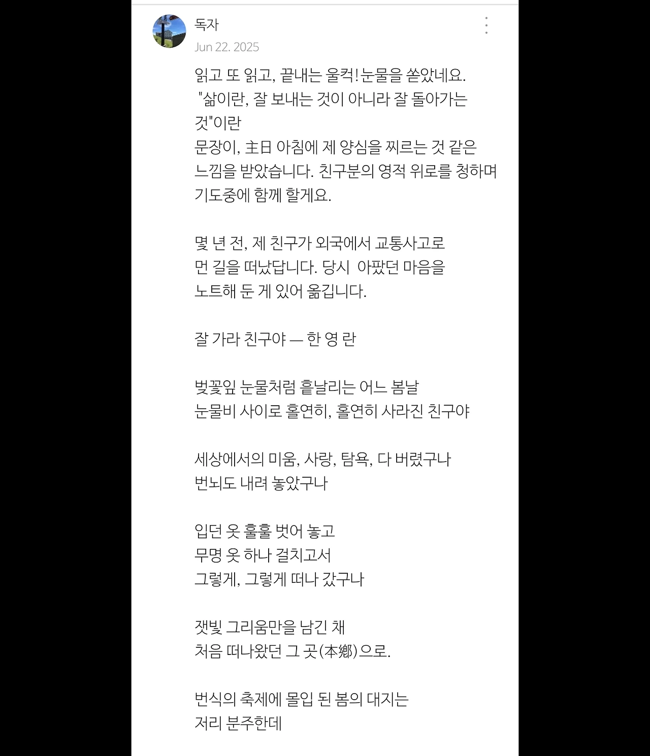 한영란 시인의 「잘 가라 친구야」를 읽고
