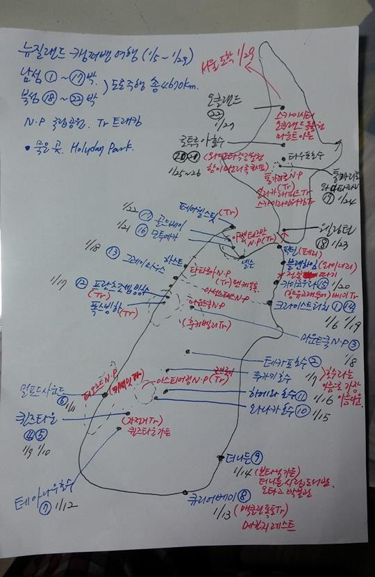 뉴질랜드의 지도가 그려진다. 빨간색으로 표시한 곳은 특별히 가슴 벅차게 아름다운 기억이 있다는 것!