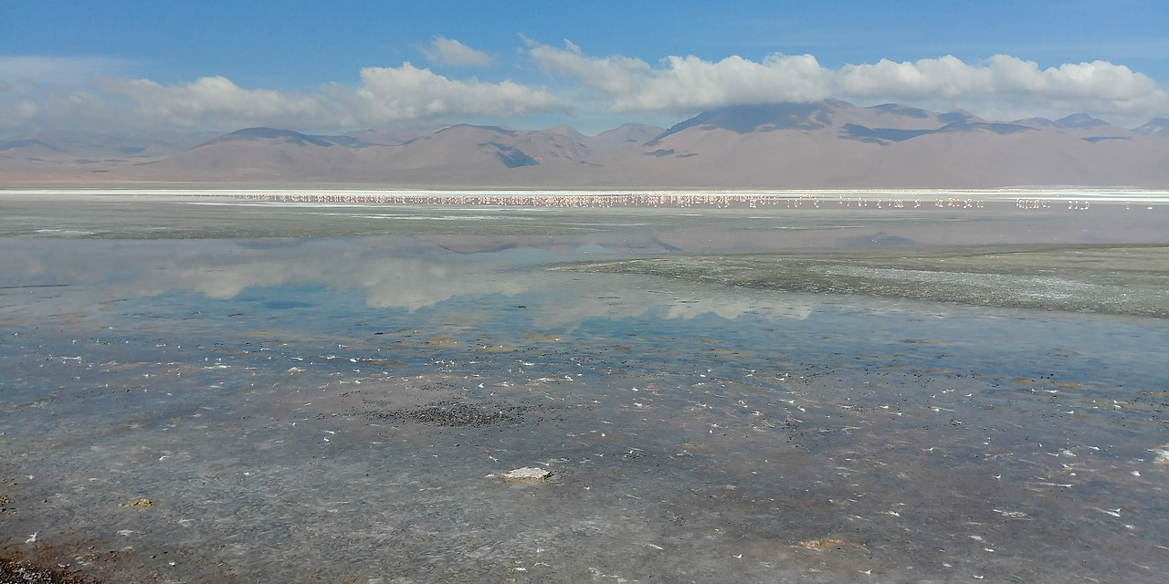 플라밍고라는 이름의 홍학들, 그들이 살고 있는 호수 앞이다.