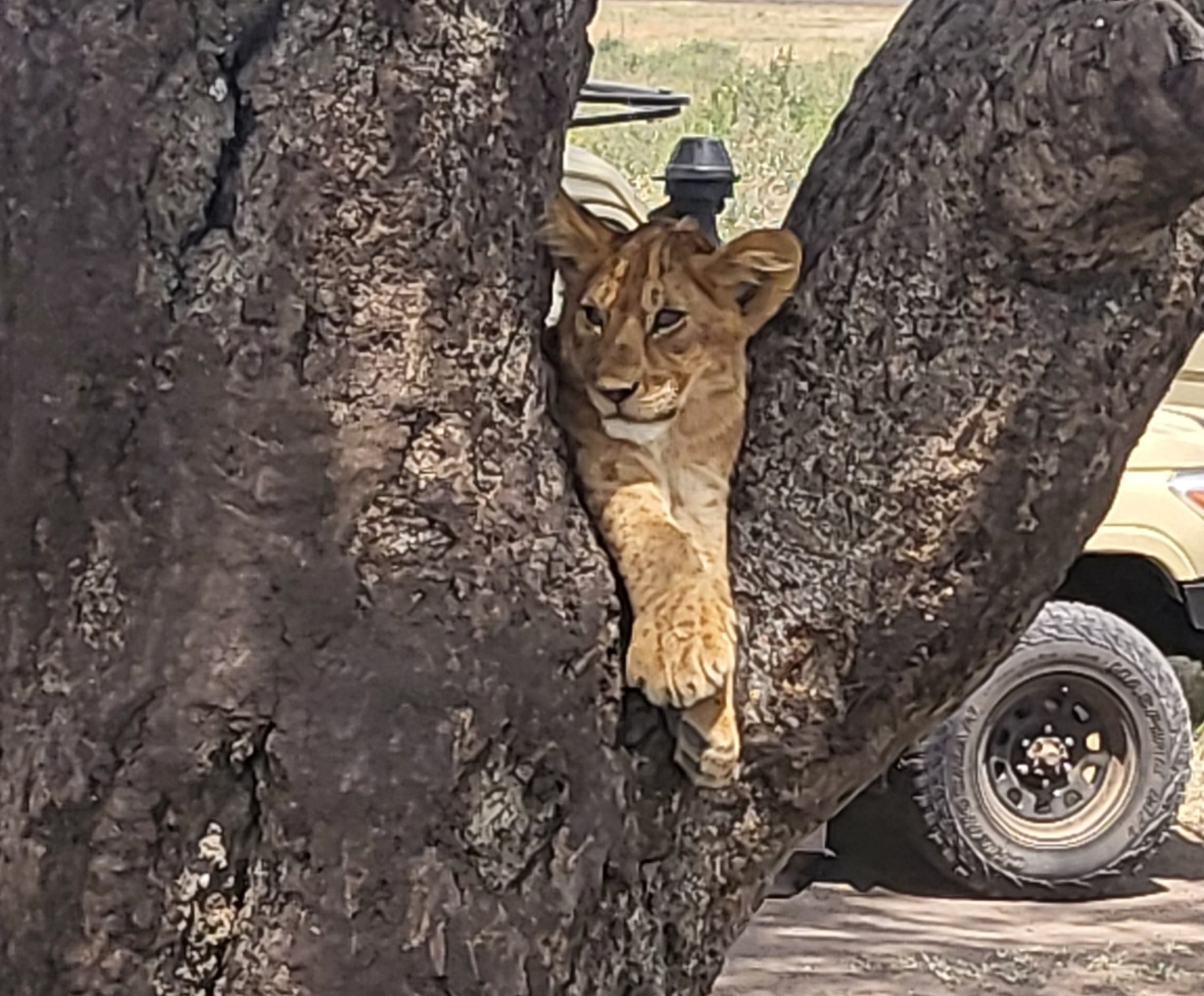 암사자와 그 작은 새끼들 다섯 마리가 흙바닥에 정신 빼놓고 자고 있다. 한 마리는 나무 가지 사이에 코를 박고 자다가 시끄러운지 실눈을 뜨고 일어난다. 바위 위에 근엄하게 갈기를 휘날리며 있어야 하는 사자가 정신줄 놓고 자고 있다니, 지프차들이 그들을 에워싸도 모른다. '라이언킹'에서 본 멋진 수사자 '심바'의 모습은 절대 아니다.