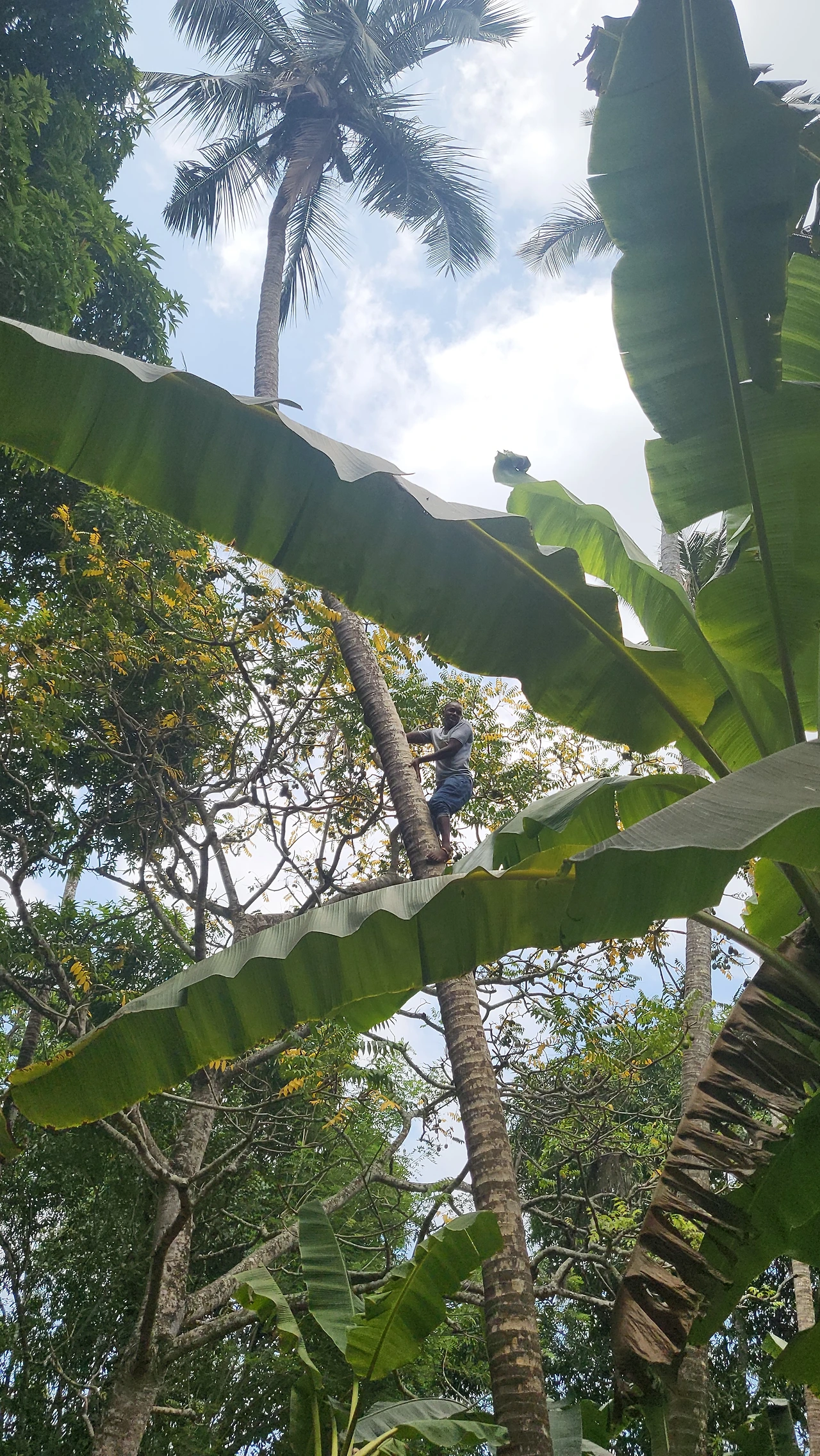한 젊은이가 두 발에 끈을 단 채 저 높은 코코넛 나무 위를 훌쩍훌쩍 올라가는데, 아래서는 하쿠나 마타타 노래를 불러주며 흥을 돋운다.