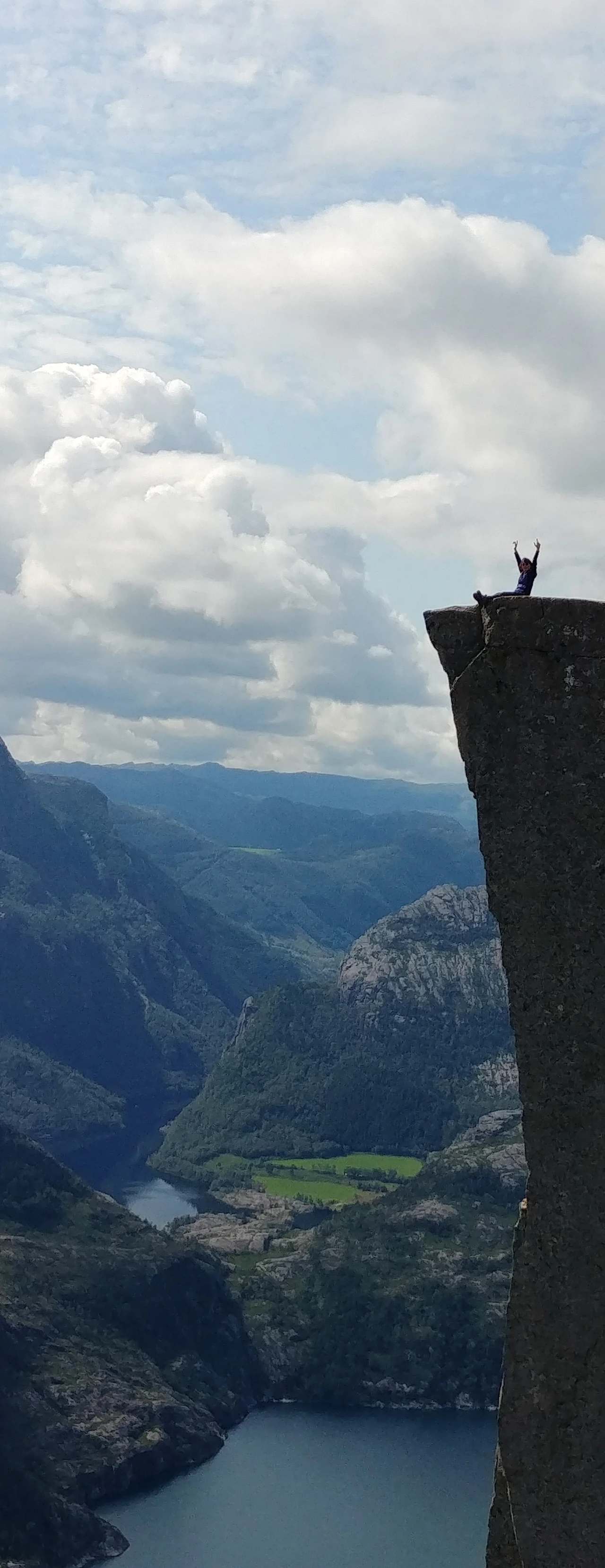 푸른 산맥과 깊은 계곡의 피오르드가 역시 비현실의 풍경으로 펼쳐져 있는 거다. 바위 가장자리를 돌며 사방을 둘러보다. 입이 헤 벌어진다. 노르웨이 멋지다!!!