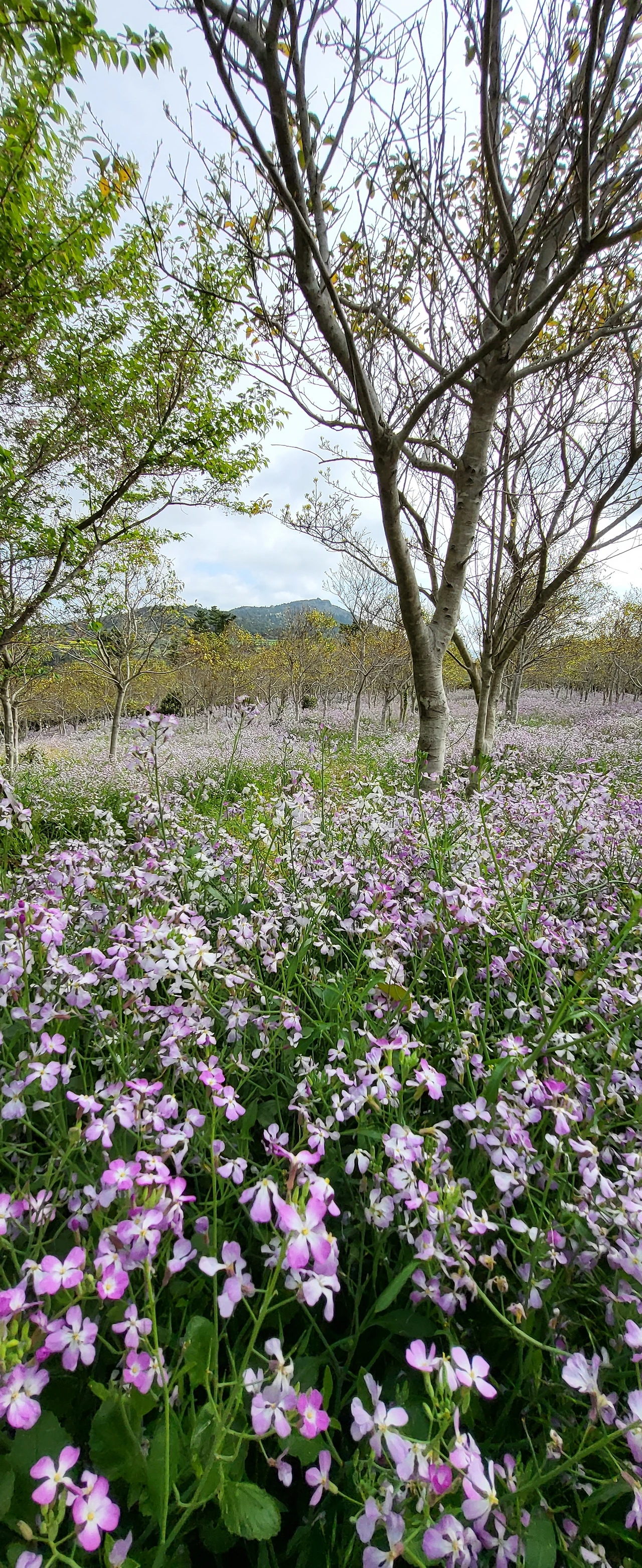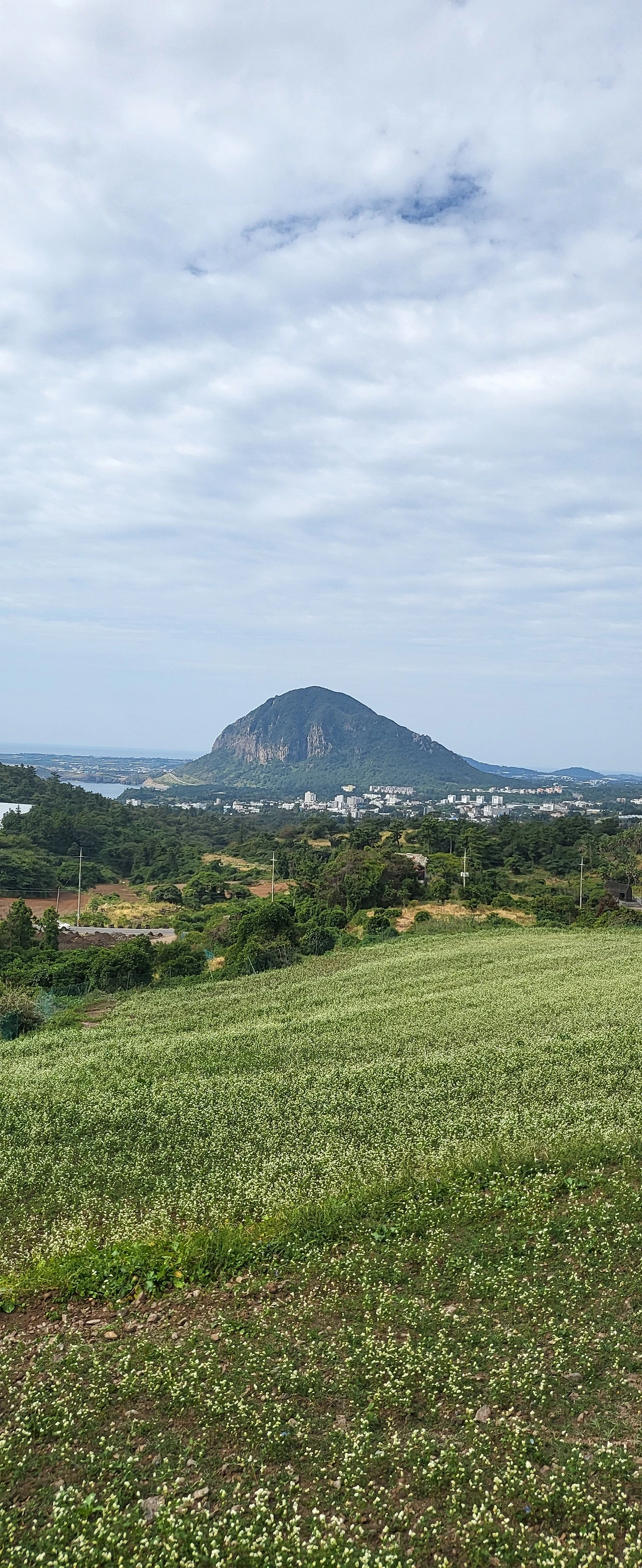 "갑자기 나타난 너른 무밭은 무릉계에 온 듯한 환상적인 느낌이었어. 제주는 정녕 봄이 가장 아름답지 않은가 싶네..." 이런 이야기를 나누며 걷다. 작은 절 앞에서 잠시 휴식. 바나나 하나와 두유를 꿀맛으로 먹는다. 저 앞에 산방산이 나타나고, 발 밑은 하얀 메밀밭이다. 그림이구나. 스틱을 꺼내 숲으로 들어선다. 군산오름으로 오르는 숲길. 시인과 촌장의 음유 음악이 딱 어울리는 그런 숲이 나타난다. 이렇게 아름다웠었나. 완만한 숲, 무성한 숲, 평화로운 숲... 우리는 사람 다 올려 보내고 맨 뒤에 올라간다. 사람 소리 없이, 서두름 없이 오늘 길을 걷고 싶구나. 시인과 촌장의 '숲' 노래를 들으며 올라간다.