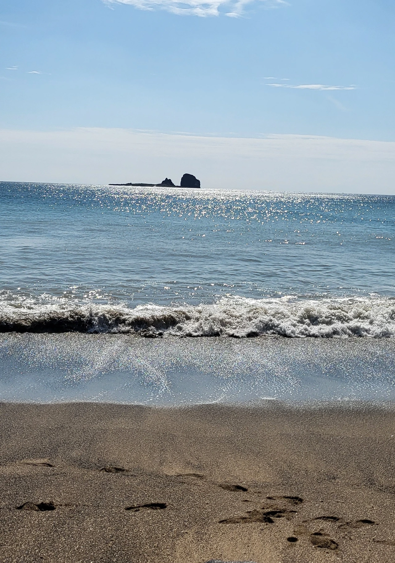 등산화를 벗는다. 햇살 쏟아지는데 파도 몰아치는데 발이 아늑하다. 검은 것이 이렇게 포근한 모래라니... 발이 호강이다. 내 몸이 호강이다. 우리는 또 웃고 신난다. 형제섬은 그러거나 말거나 그림 같이 묵묵히 인간들을 지켜본다 이거지. 그 앞에서 신발 들고 척! 파도랑 더 놀고 싶기는 하다. 그러나 윗길의 너른 평야에 나 있는 길이 얼마나 평화로운지 알지. 발을 씻고 올라간다. 일행들이 앞뒤로 이어진다. 오늘은 한 40여 명 걷나 보다.