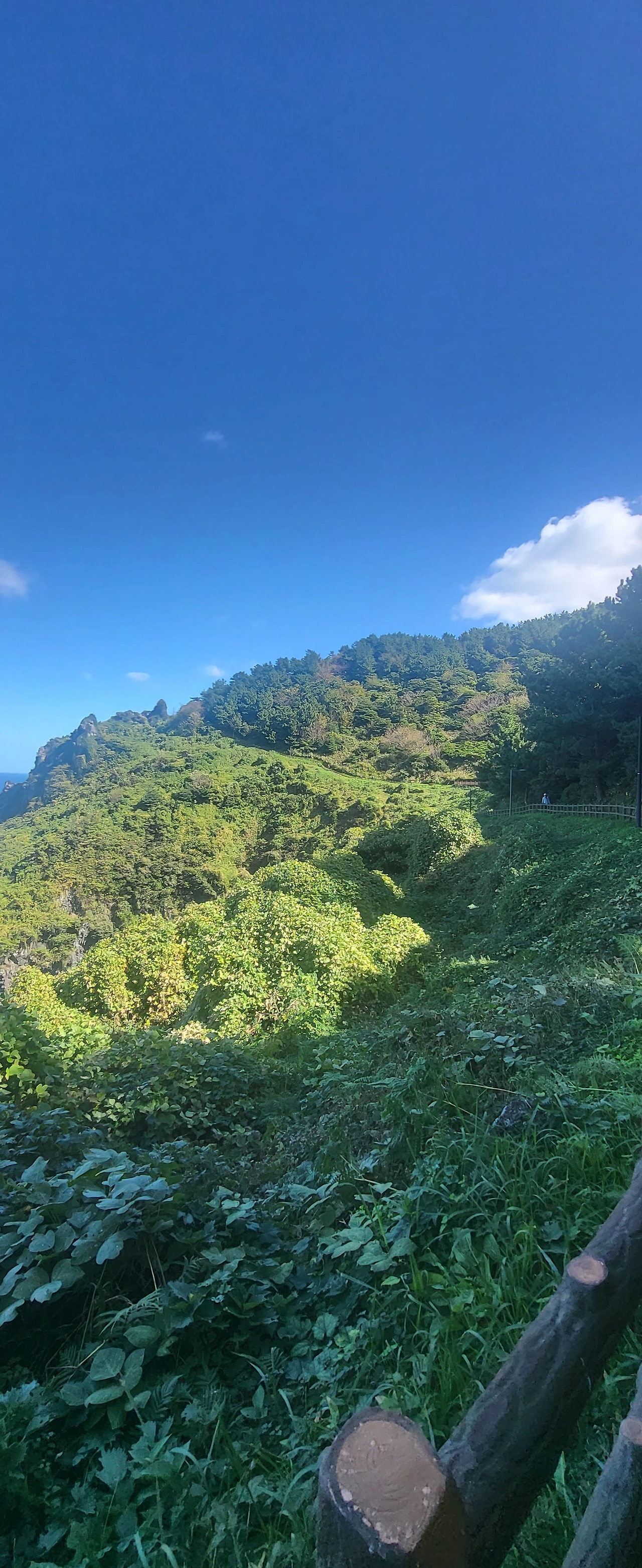 왼쪽으로 북쪽의 바다, 제주항, 그리고 봉우리 옆을 지나는 해안길이 그림처럼 펼쳐져 있다. 따가운 햇살일 텐데 따사로운 햇살로 느껴진다. 바다를 보며 천천히 걷는다. 평화롭다.