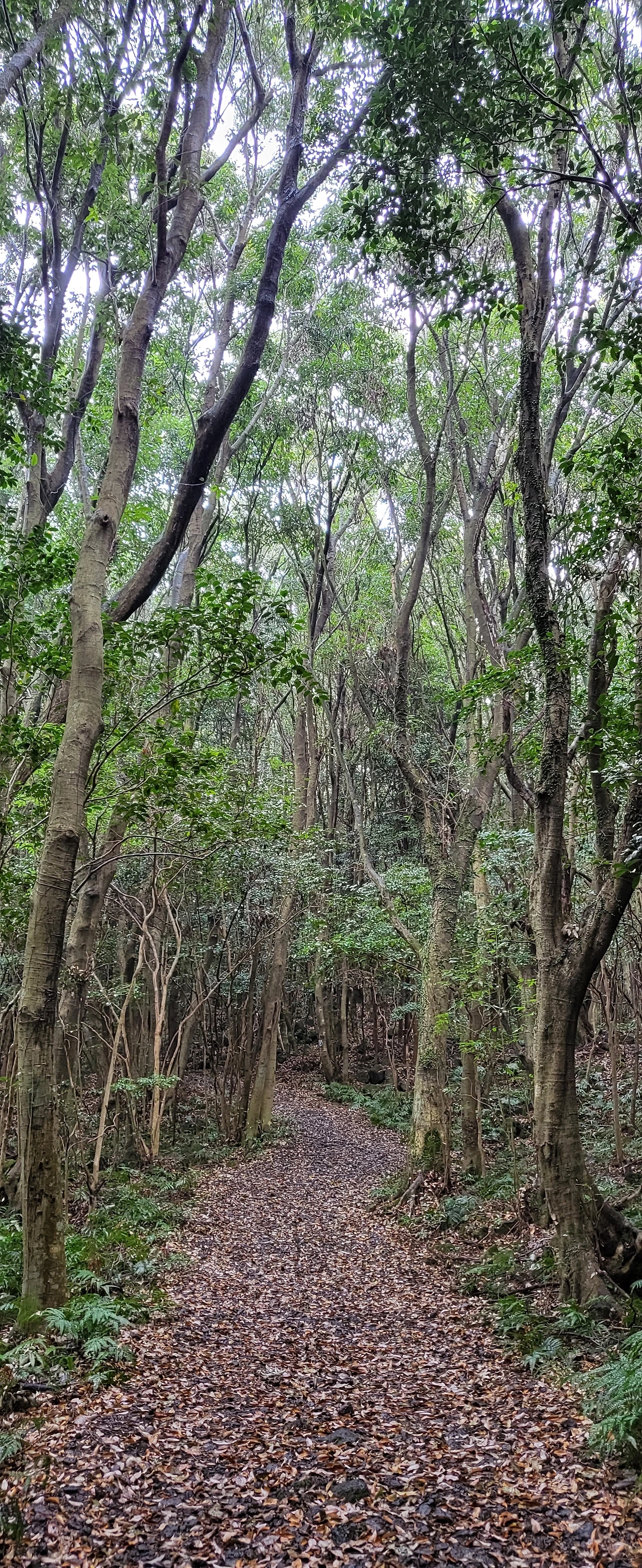 숲길이 이어지는데 하늘을 빼곡히 가리는 크고 긴 나무들은 모두 동백나무들이 아닌가……. 여수의 오동도섬, 사려니숲길, 비자림……. 모두 아름다운 숲길이지만 여기는 사람 다니는 길 외엔 손대지 않은 자연 그대로의 원시림이다.