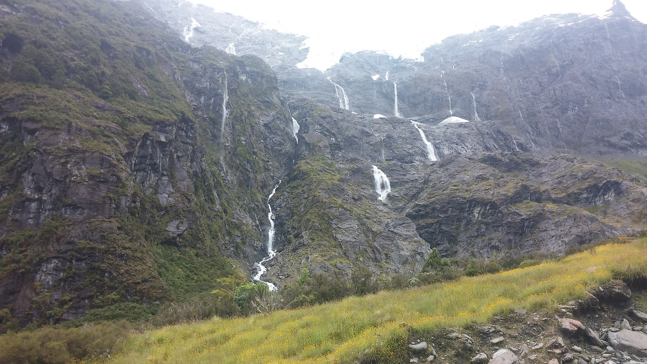 노란 꽃 뭐냐 그 꽃 이름이 민들레 같은 작은 노란 꽃이 고원을 덮고 있고 저 위에는 쏟아질 듯 빙하가, 그리고 주변 산 곳곳에는 굵고 가느다란 폭포가 흘러내리고 있는 것이다.